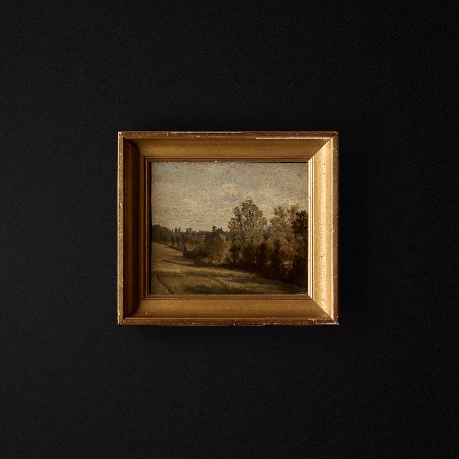 * The frame shows surface wear and scratches consistent with age, with chips on the frame edge that reveal the underlying wood and gesso, including longer chips along the top of the frame. There is also a slight gap visible at both the top and bottom between the canvas and the frame. The painting itself is in good condition, with a couple of isolated small dots of paint loss.