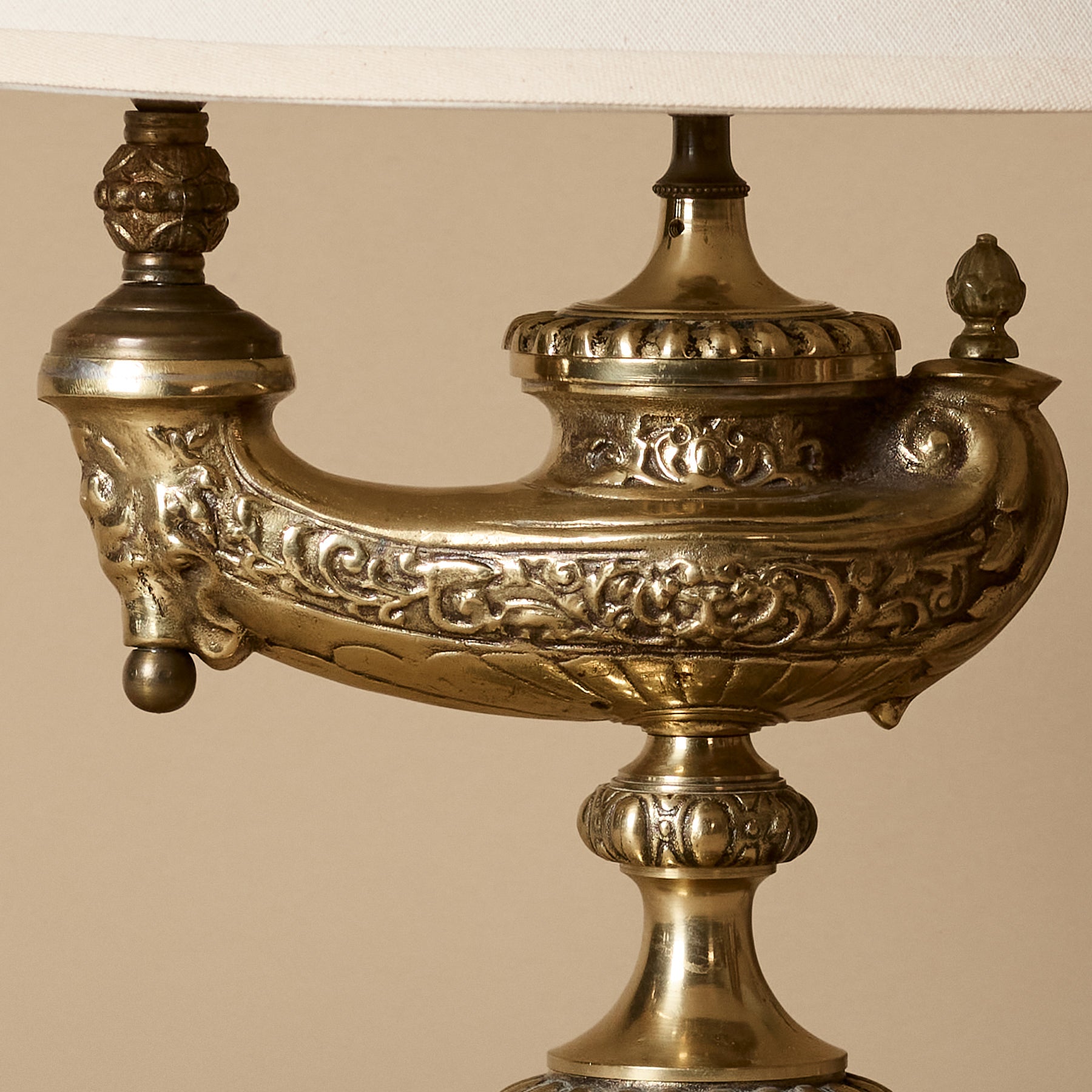 * Requires a smaller bulb than standard. This lamp has a beautiful aged patina with wear, dark marks, and tonal variations throughout. There is some darkening within the engravings, as well as light pitting.