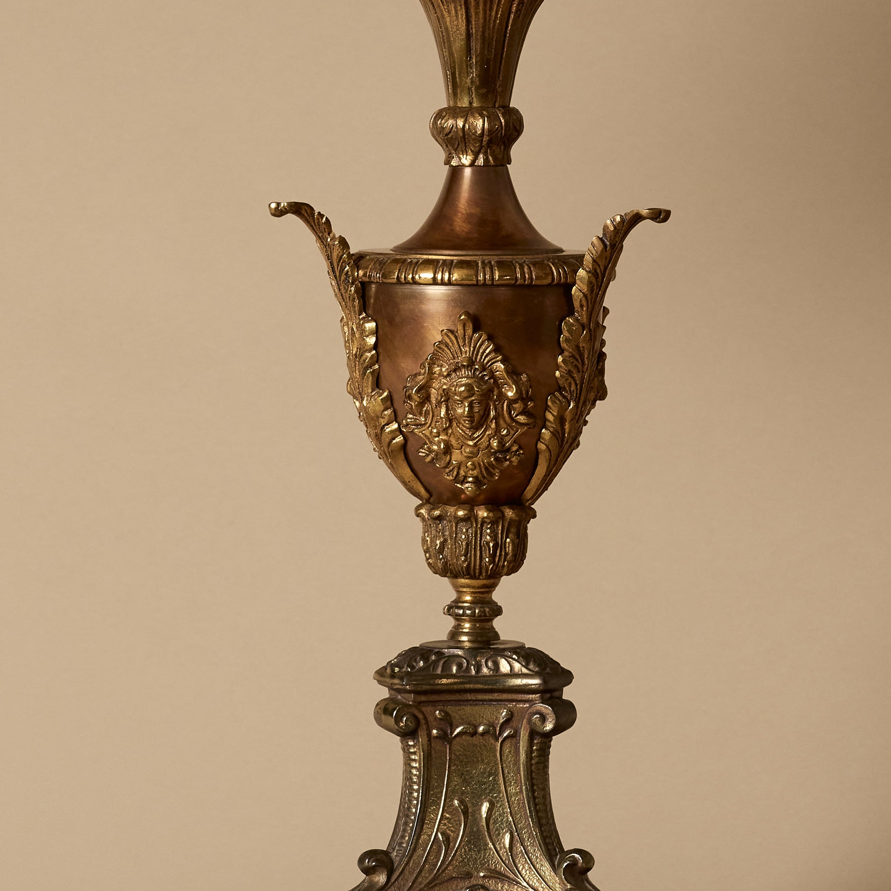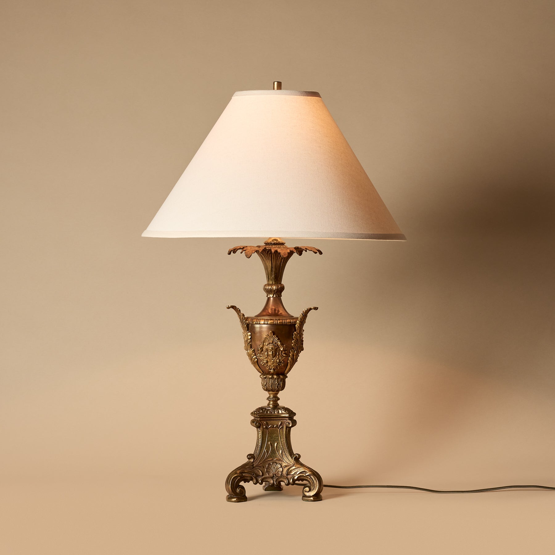 * This lamp has a beautiful aged patina with natural variations throughout. General wear, dark spots, and oxidation are visible, with one small area of patina loss on the metal cup behind the face.