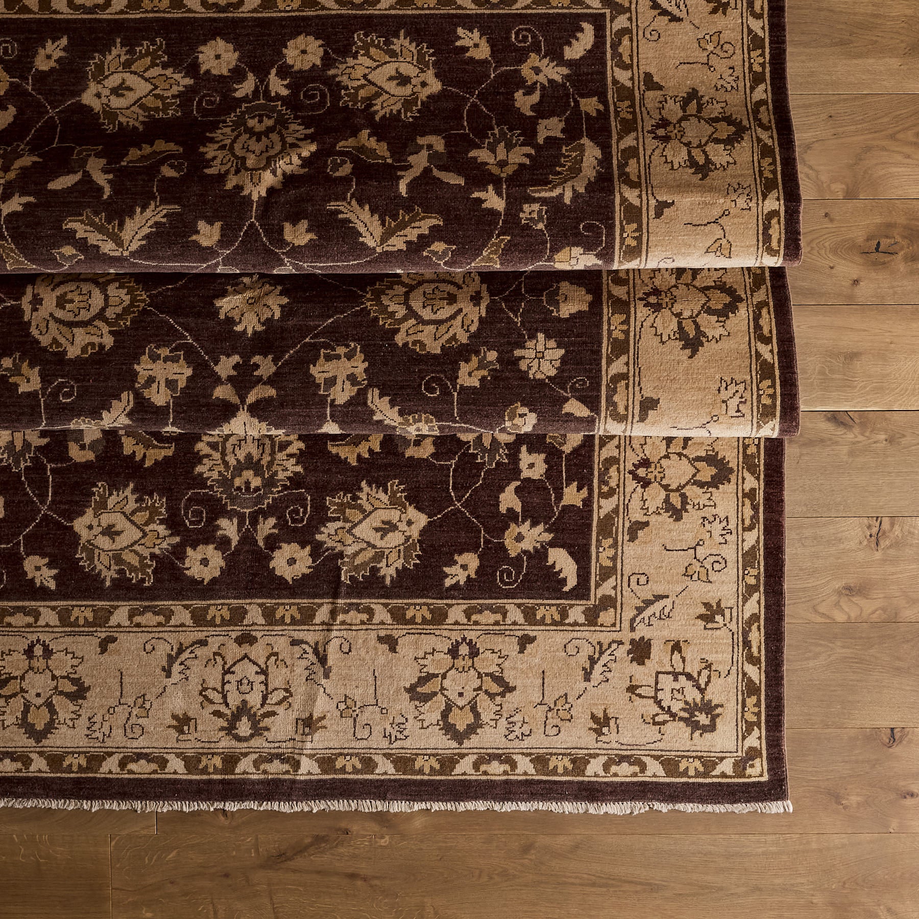 The Aline Rug is a luxurious one-of-a-kind rug constructed from 100% Wool and a cotton foundation. Beautifully hand-knotted and made by local artisans, this rug with dark brown, beige, brown, tan and light grey accents will bring warmth and refinement to any space.
