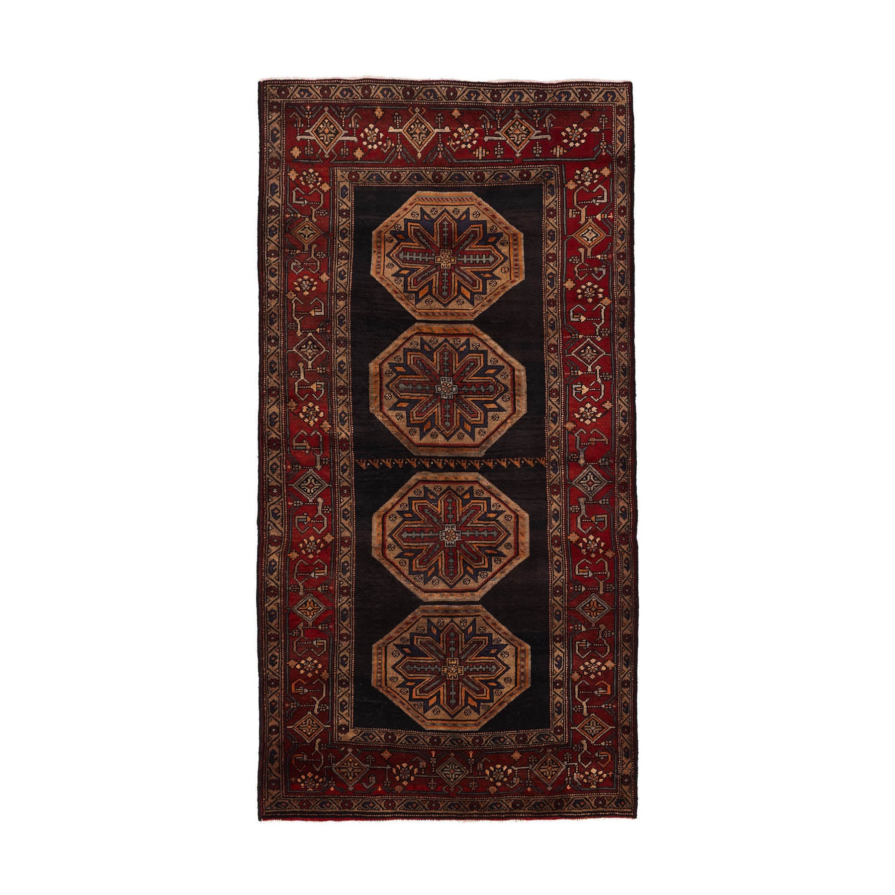 The Annesso Rug is a luxurious one-of-a-kind rug constructed from 100% Wool and a cotton foundation. Beautifully hand-knotted and made by local artisans, this rug with dark red, black, brown, blue, dark grey, light orange and tan accents will bring warmth and refinement to any space.