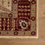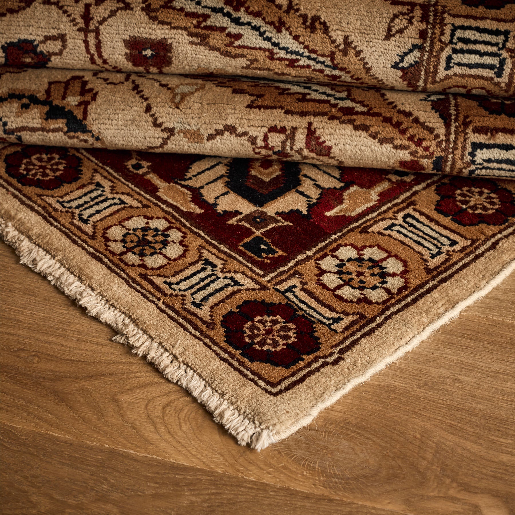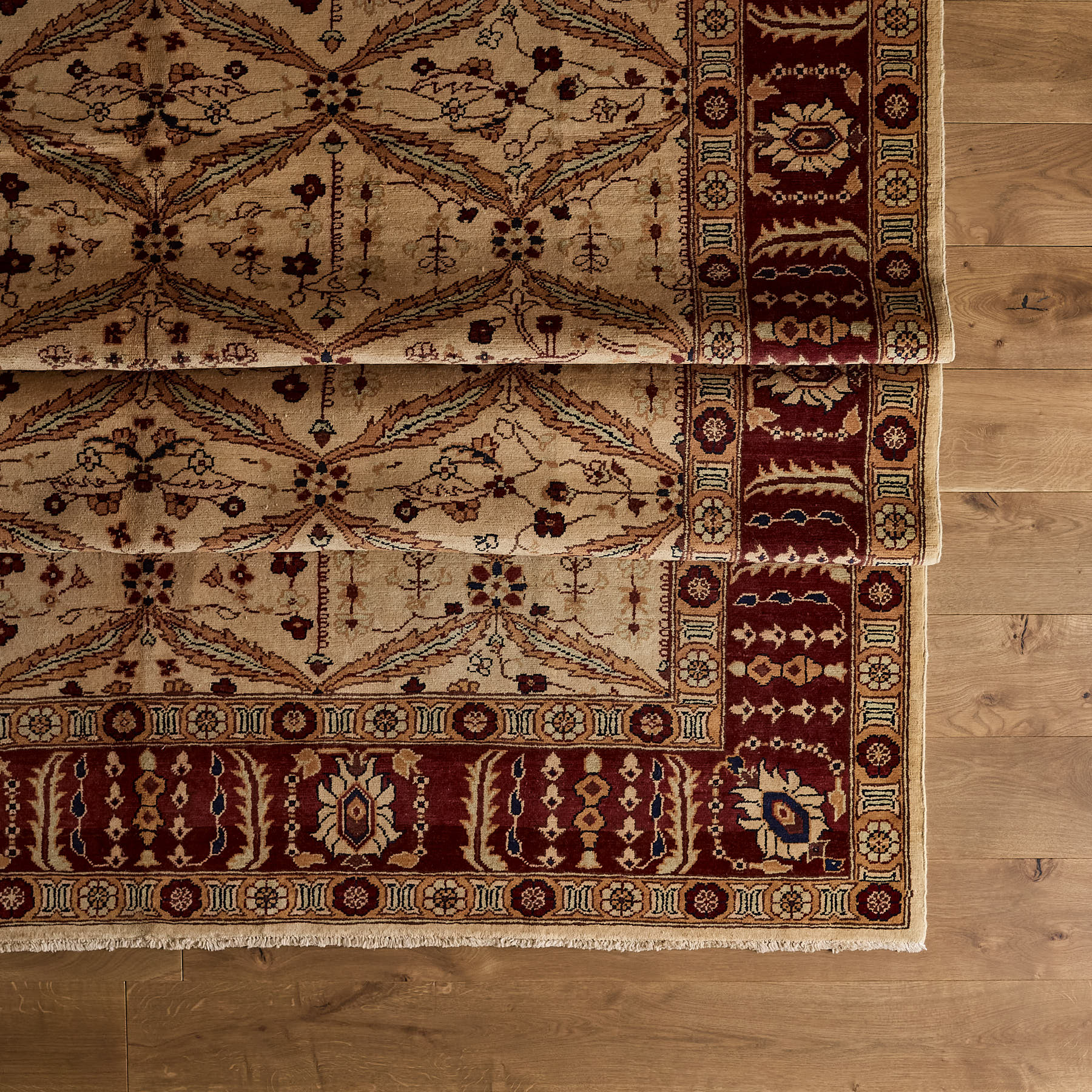 The Astrid Rug is a luxurious one-of-a-kind rug constructed from 100% Wool and a cotton foundation. Beautifully hand-knotted and made by local artisans, this rug with ivory, tan, burgundy, dark navy, dark red, taupe and light blue accents will bring warmth and refinement to any space.