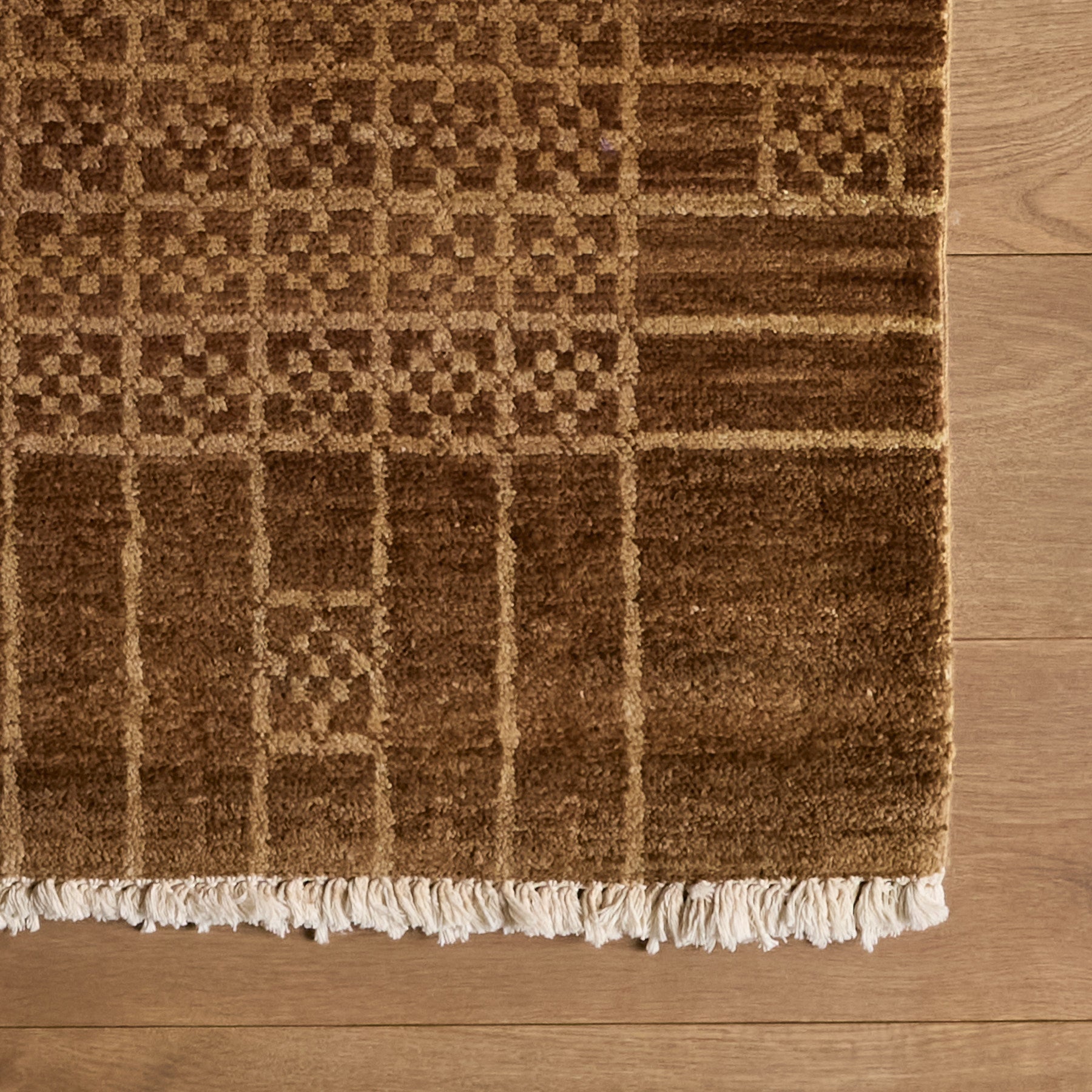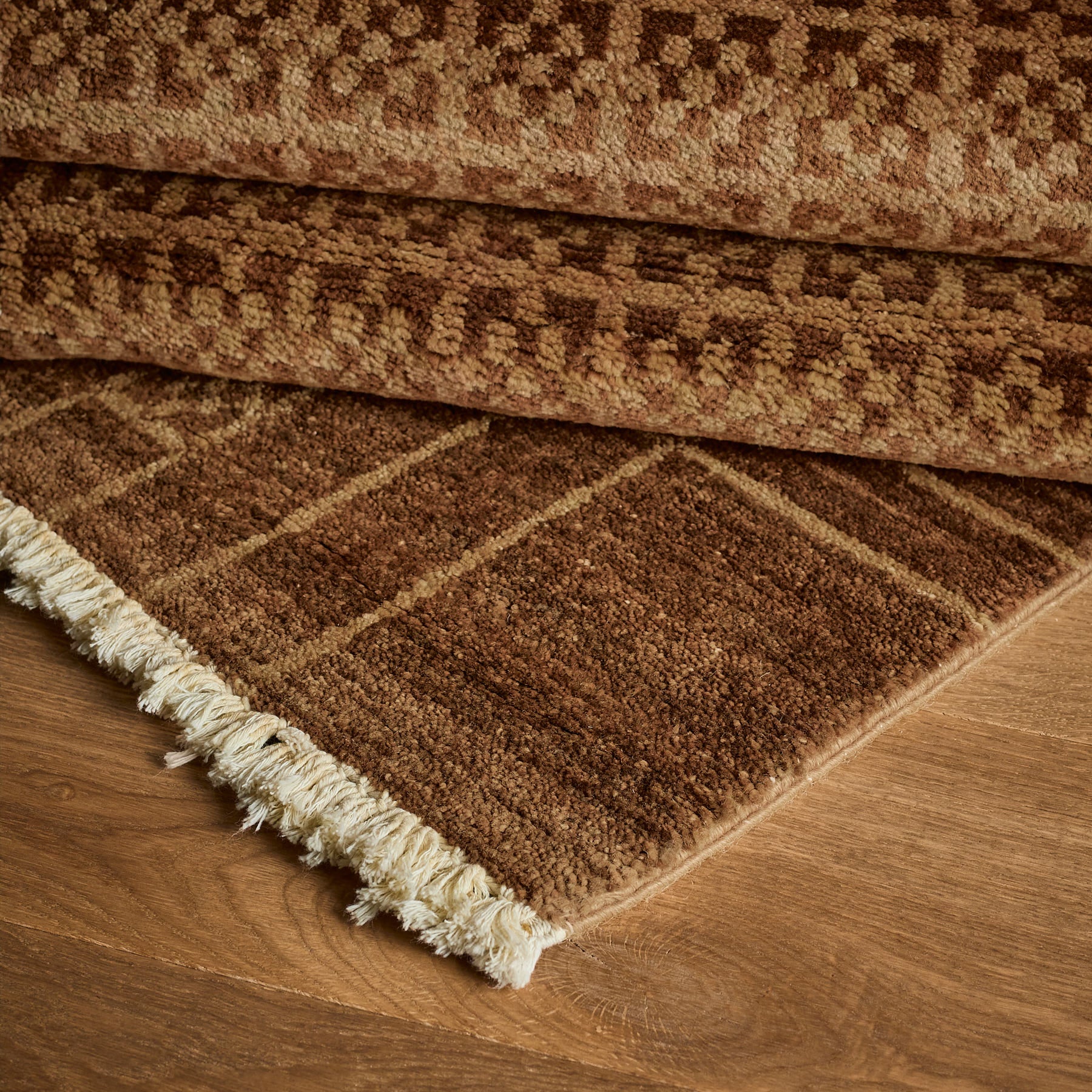The Bethany Rug is a luxurious one-of-a-kind rug constructed from 100% Wool and a cotton foundation. Beautifully hand-knotted and made by local artisans, this rug with brown, tan, khaki and ivory accents will bring warmth and refinement to any space.