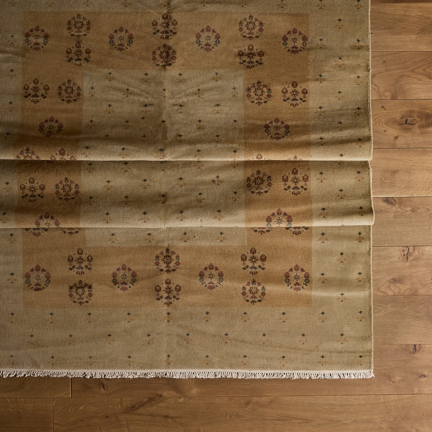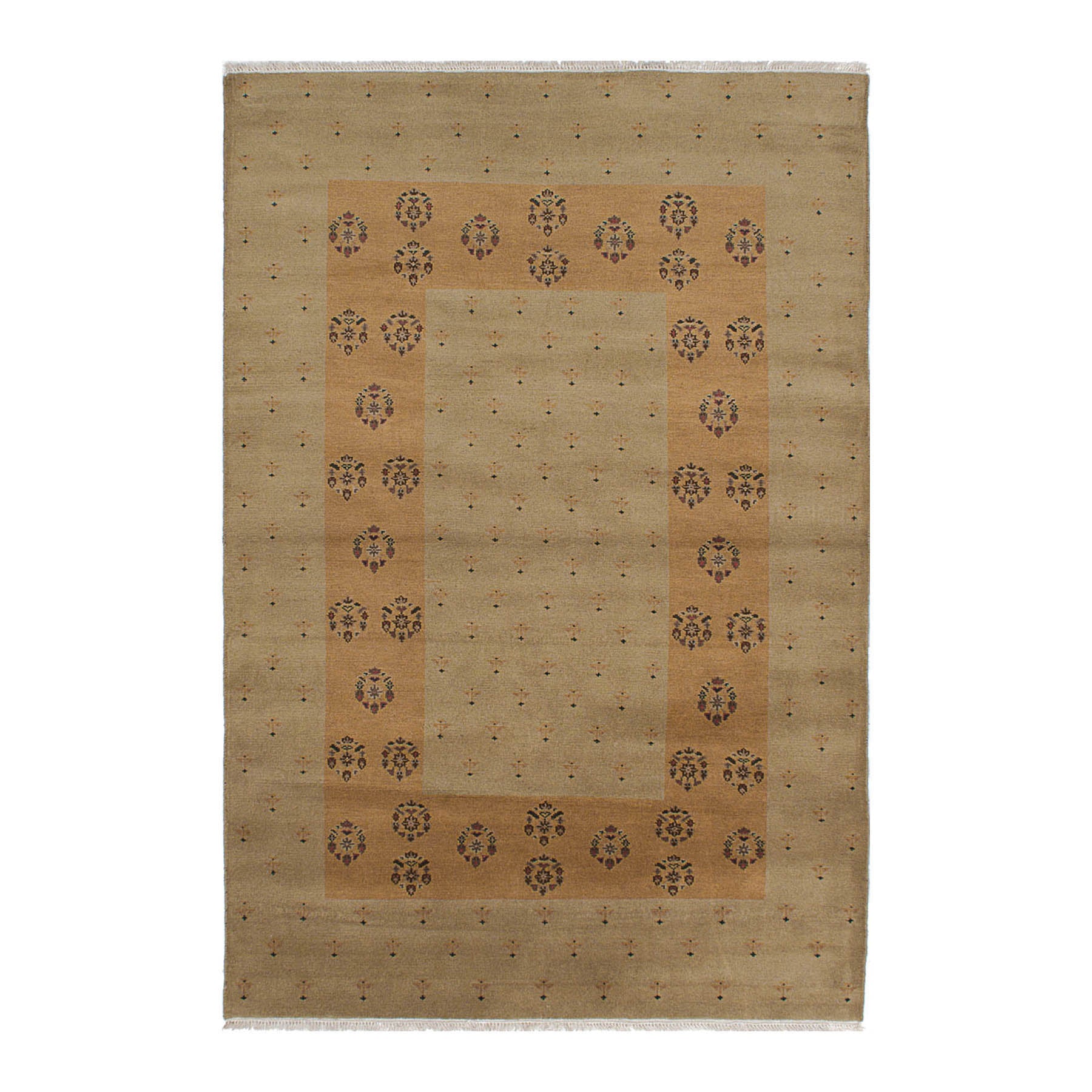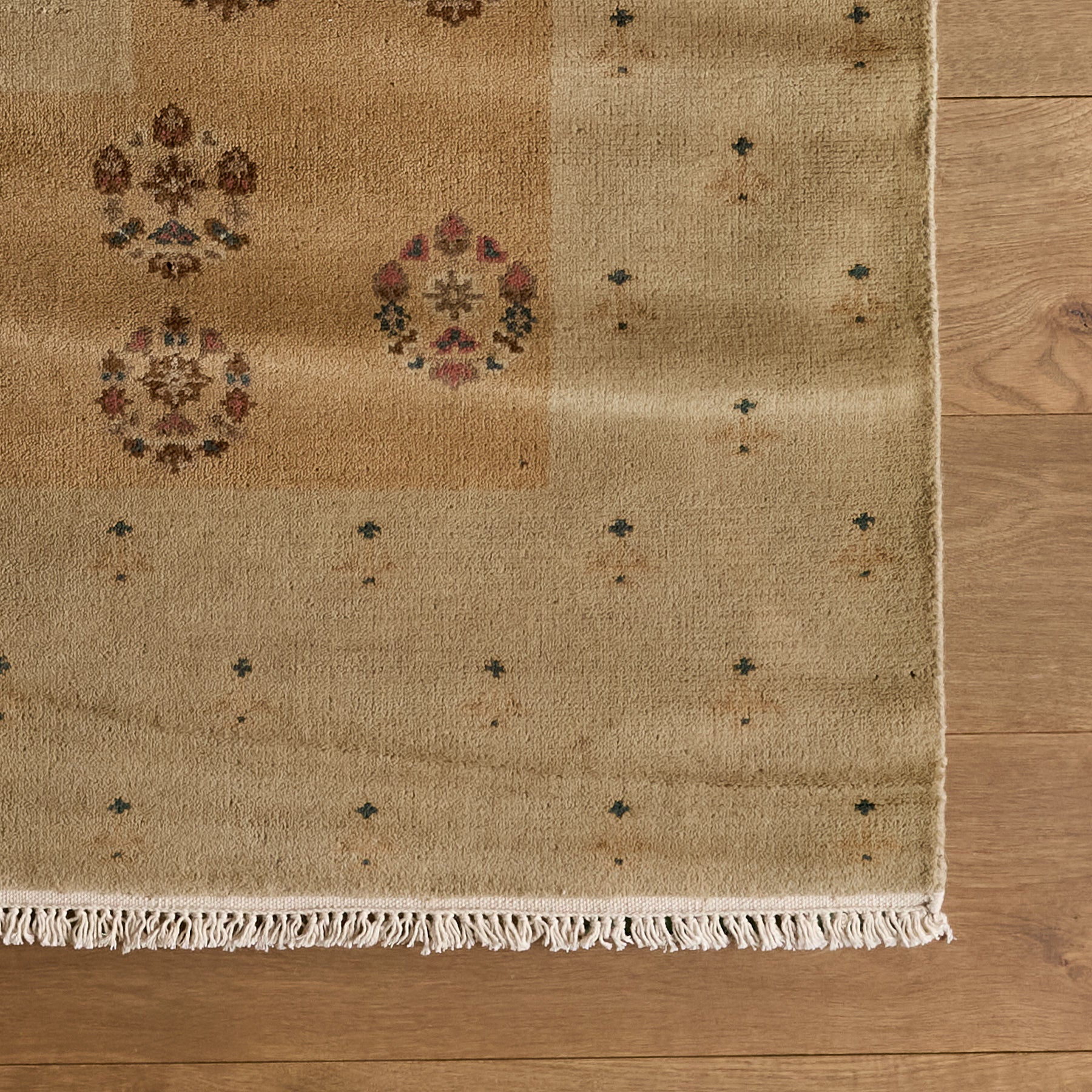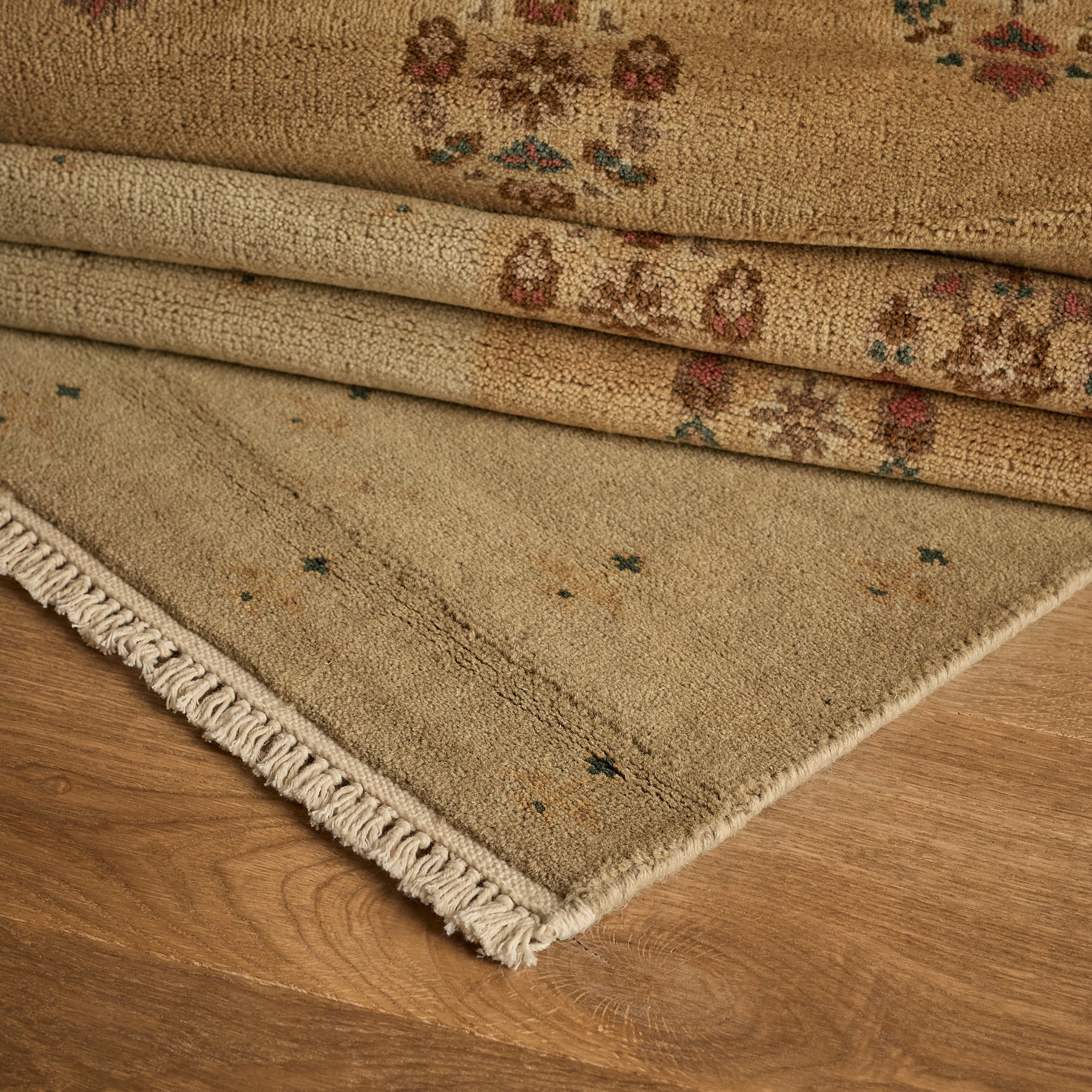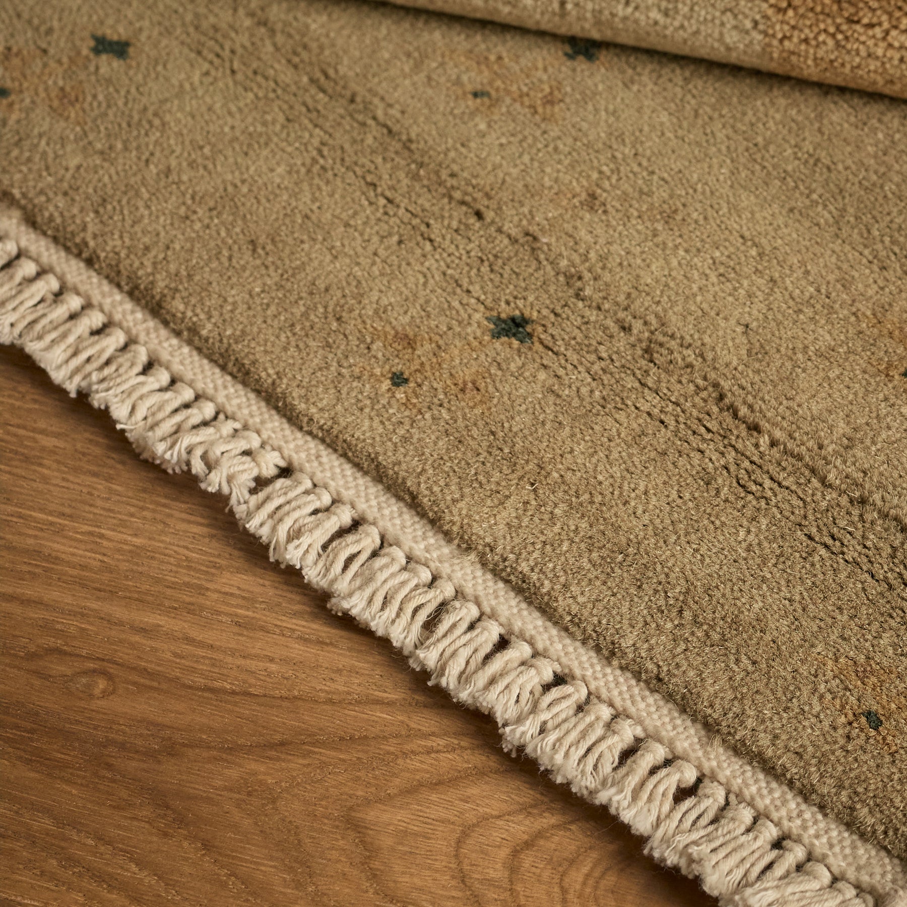 The Darius Rug is a luxurious one-of-a-kind rug constructed from 100% Wool and a cotton foundation. Beautifully hand-knotted and made by local artisans, this rug with light khaki, ocher, brown, copper and teal accents will bring warmth and refinement to any space.