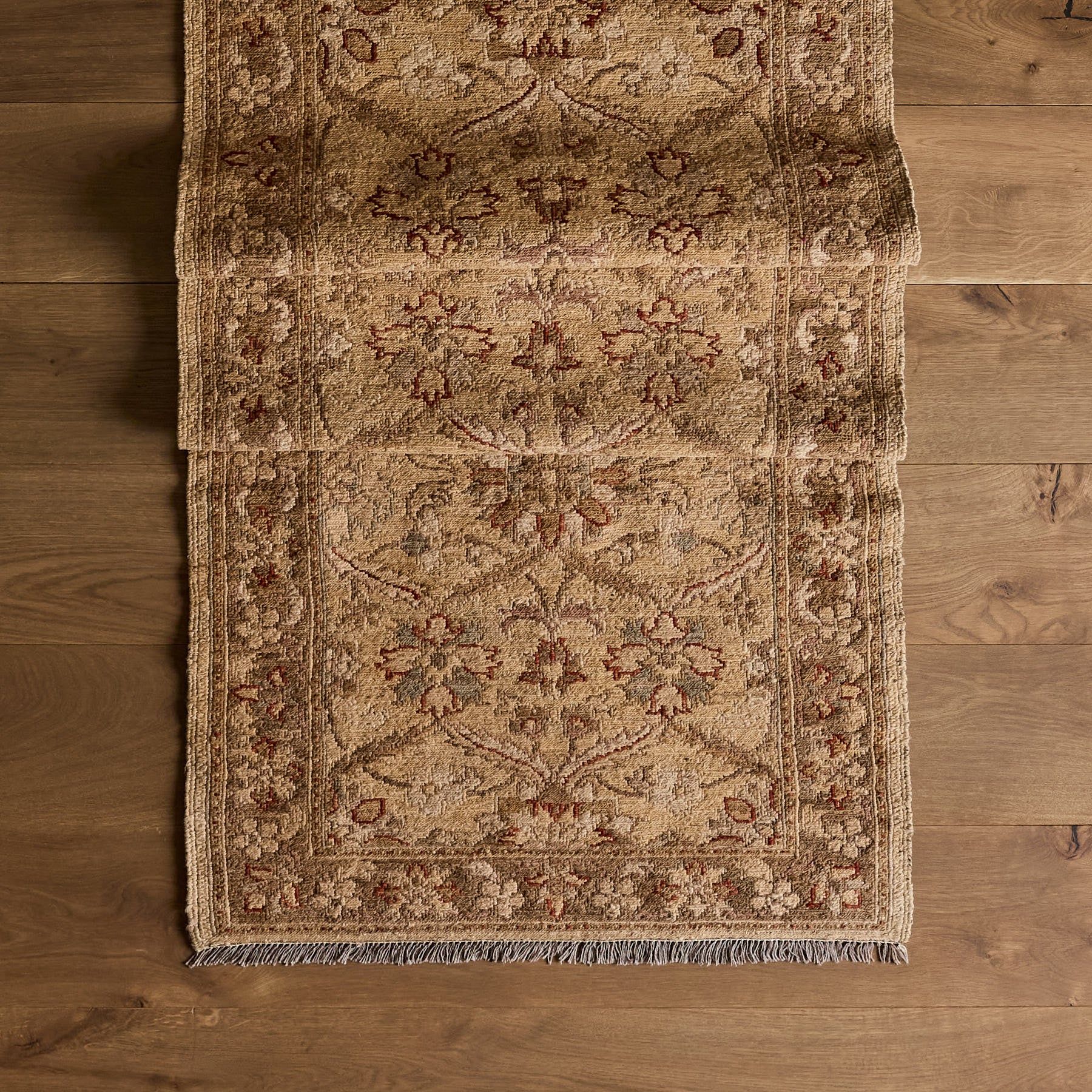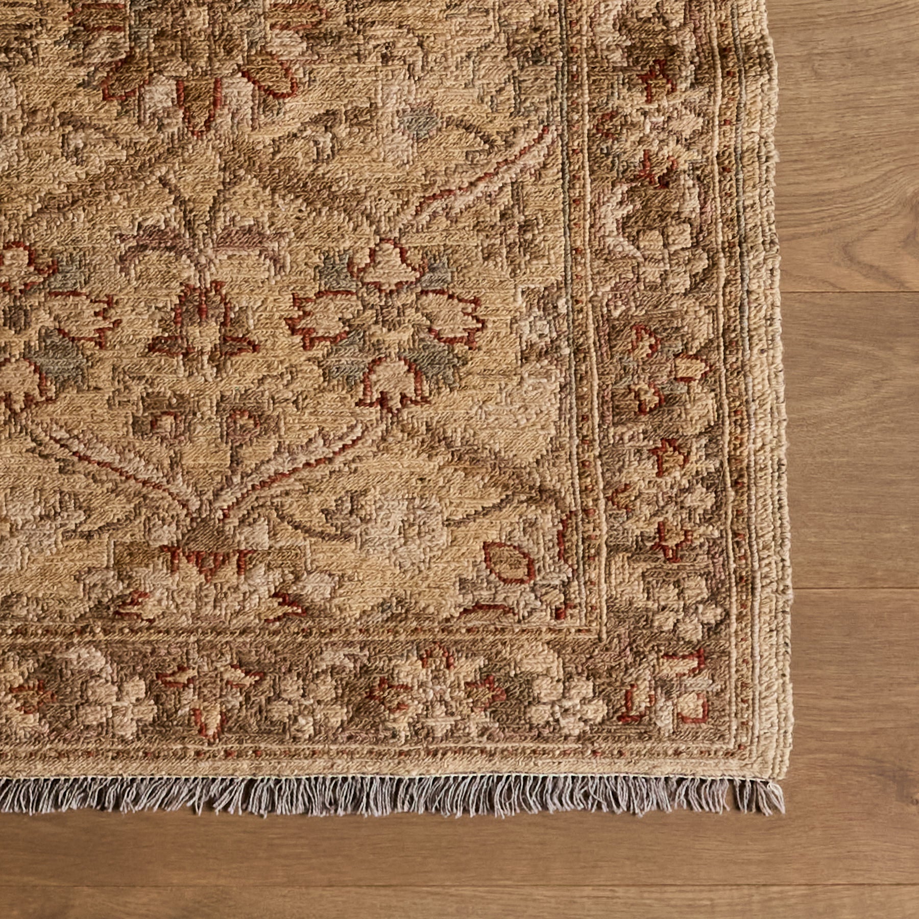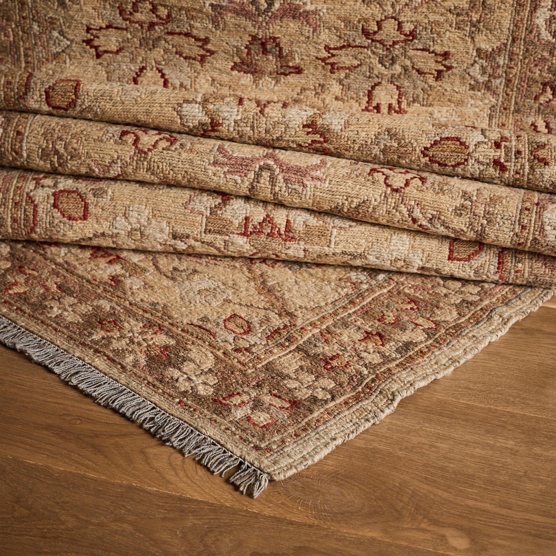 The Drew Rug is a luxurious one-of-a-kind rug constructed from 100% wool and a cotton foundation. Beautifully hand-knotted and made by local artisans, this rug with beige, khaki, light khaki and red accents will bring warmth and refinement to any space.