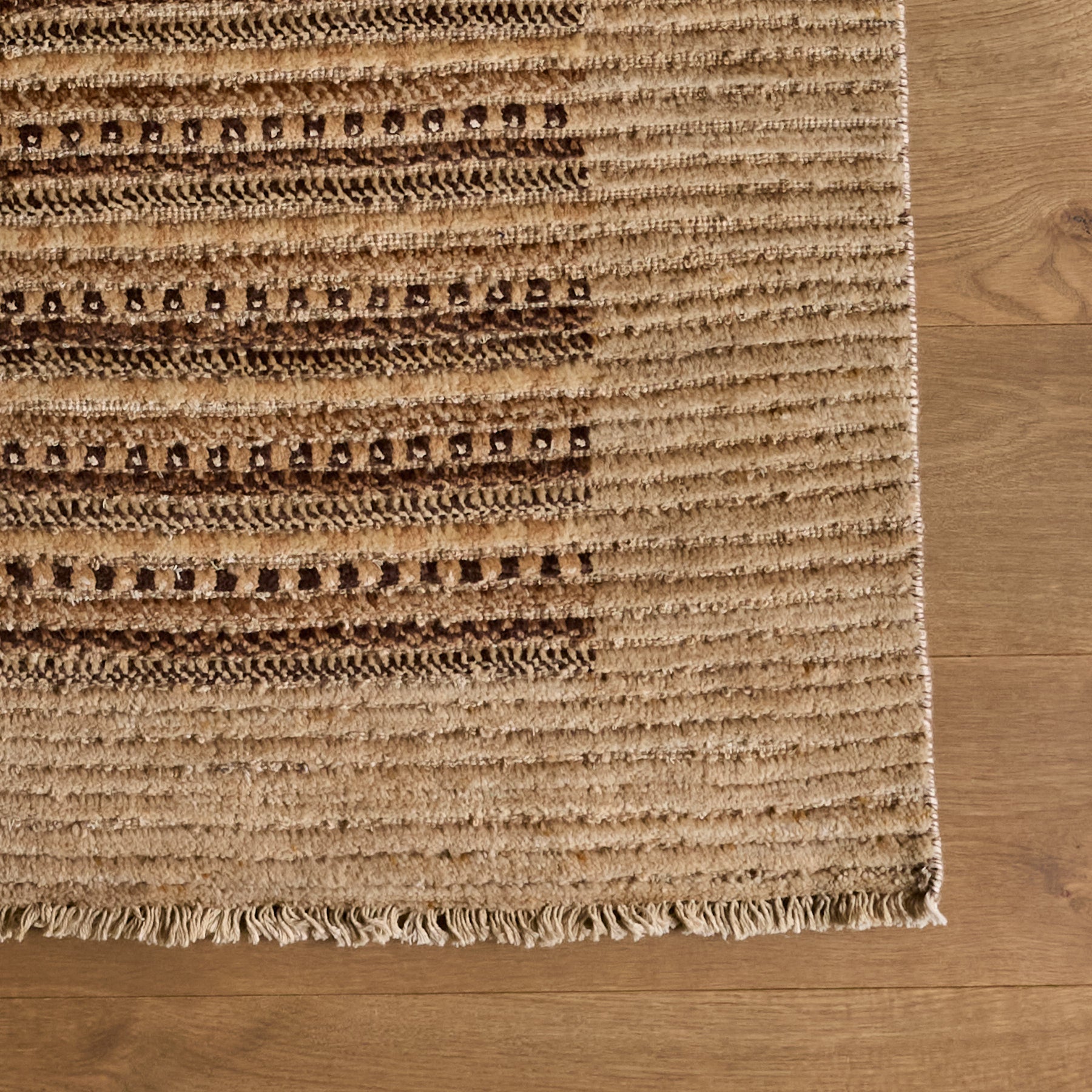 The Elias Rug is a luxurious one-of-a-kind rug constructed from 100% Wool and a cotton foundation. Beautifully hand-knotted and made by local artisans, this rug with beige, brown, tan and taupe accents will bring warmth and refinement to any space.