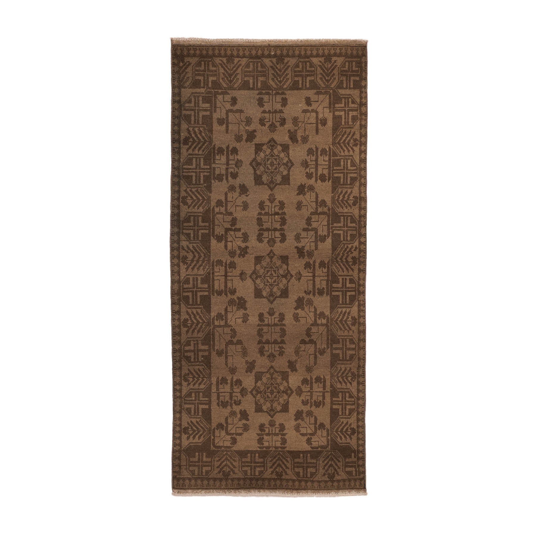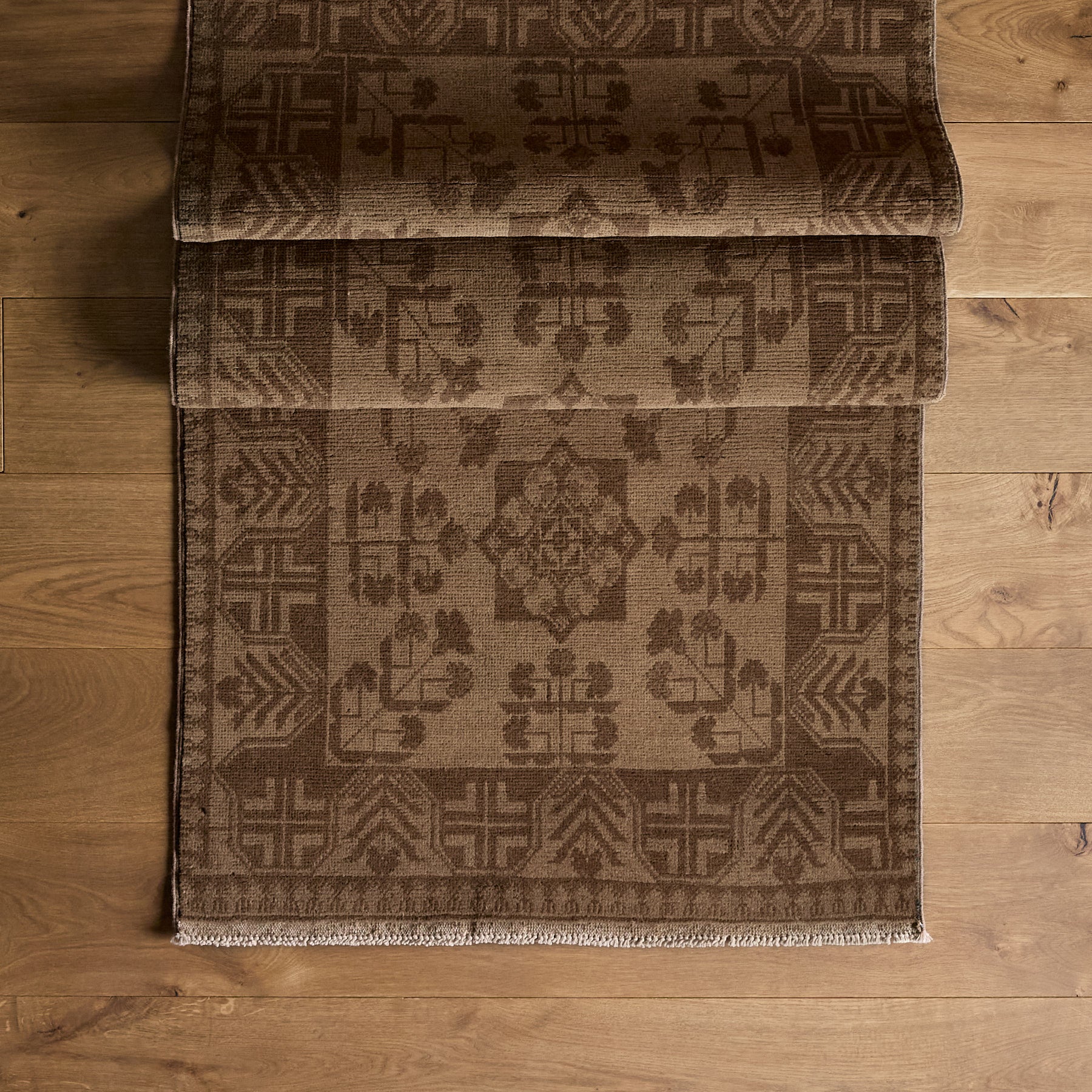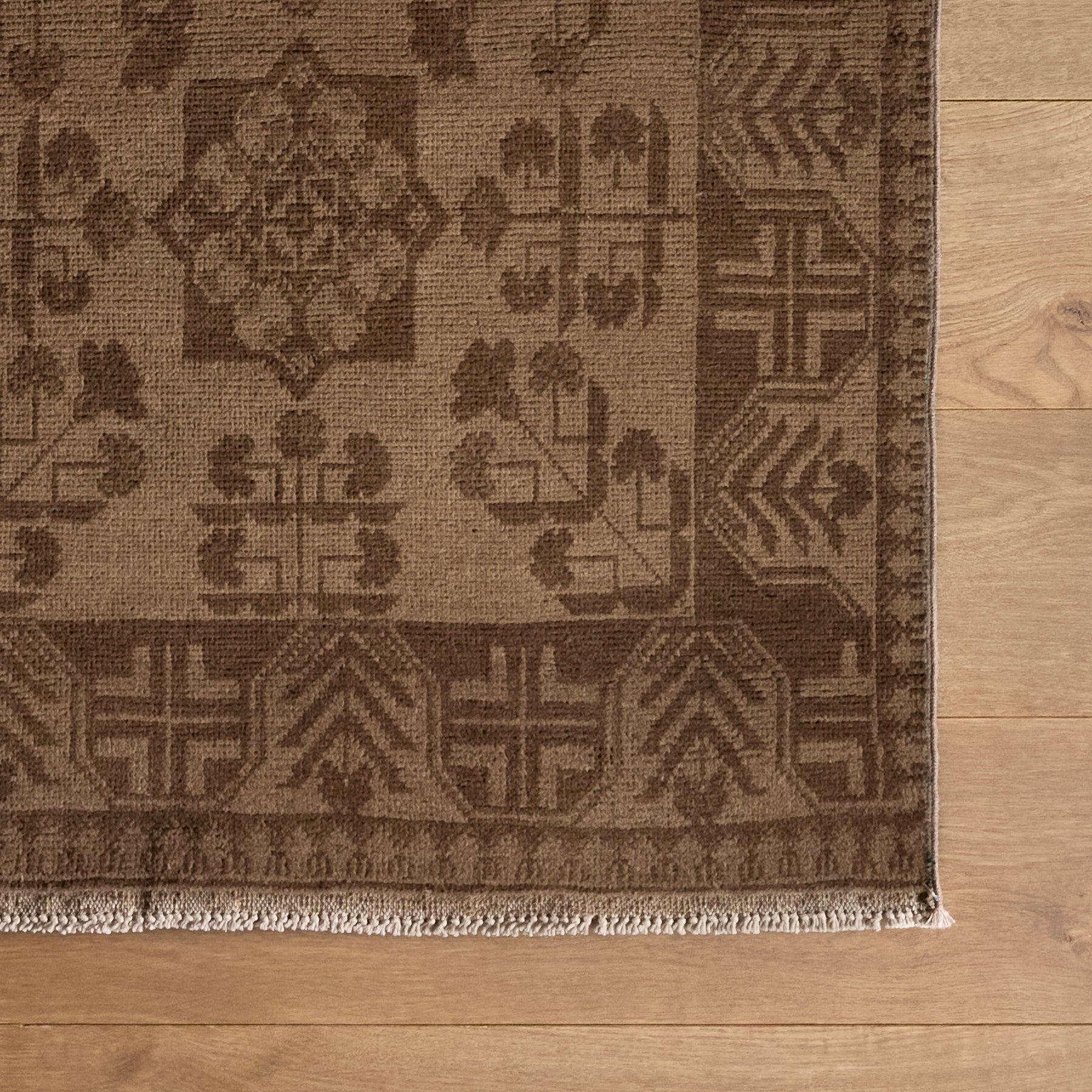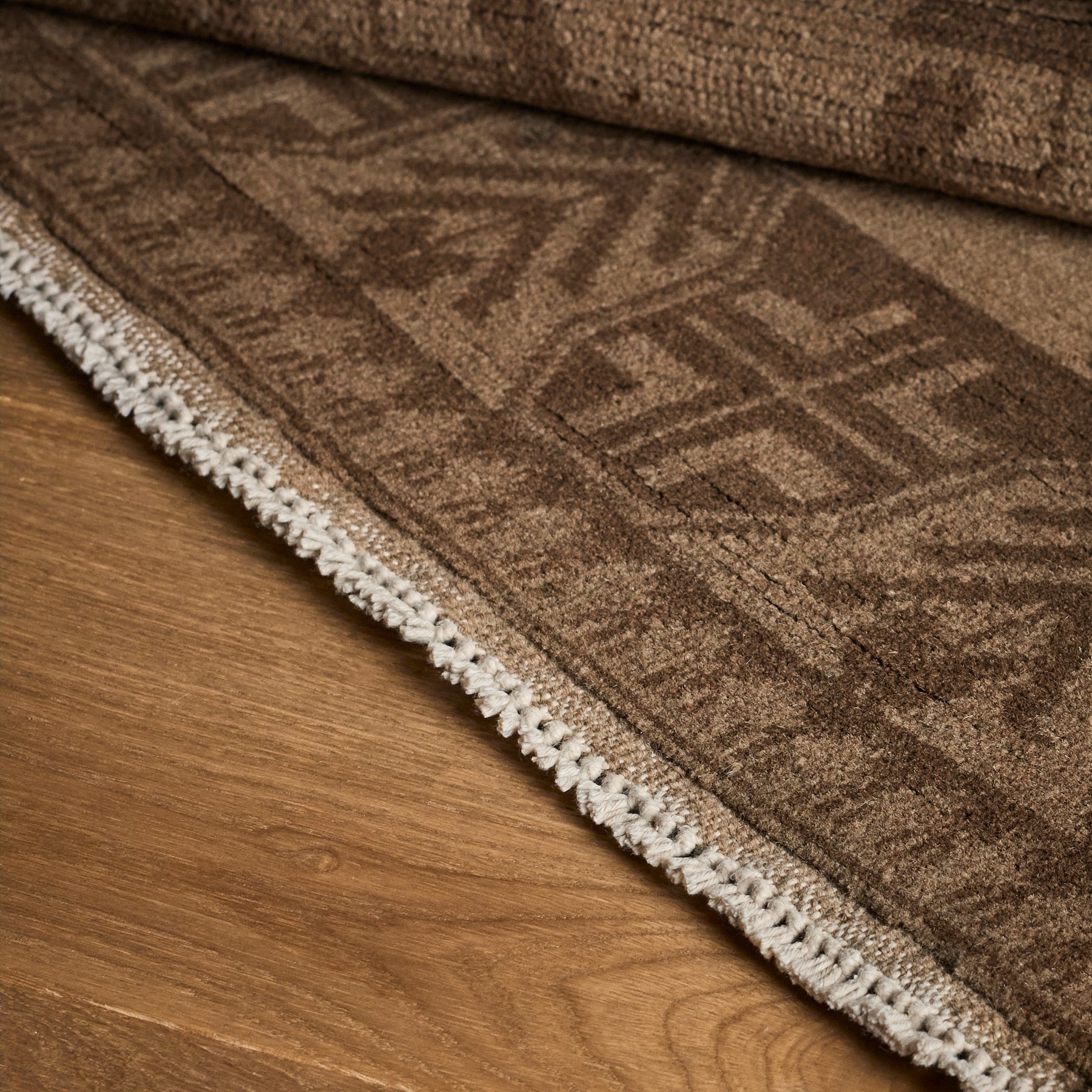 The Elsie Rug is a luxurious one-of-a-kind rug constructed from 100% wool and a cotton foundation. Beautifully hand-knotted and made by local artisans, this rug with brown accents will bring warmth and refinement to any space.