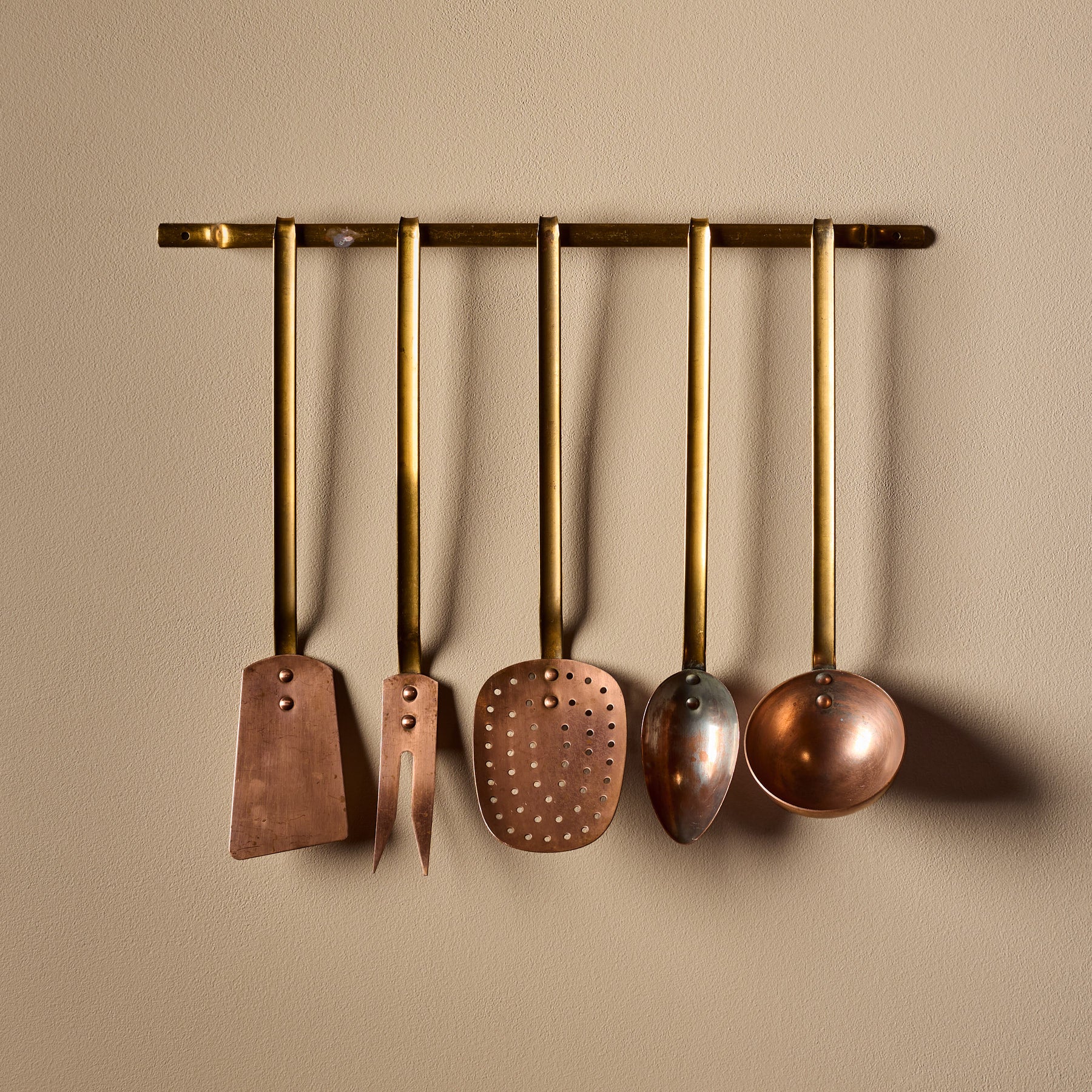 Handpicked from markets across Europe, this Vintage European Copper Utensil Set Circa 1900s offers a glimpse into old-world Europe, filled with rich history and vibrant stories. Its subtle chips and wear add character, making it a truly unique piece brimming with authenticity and timeless charm.