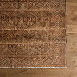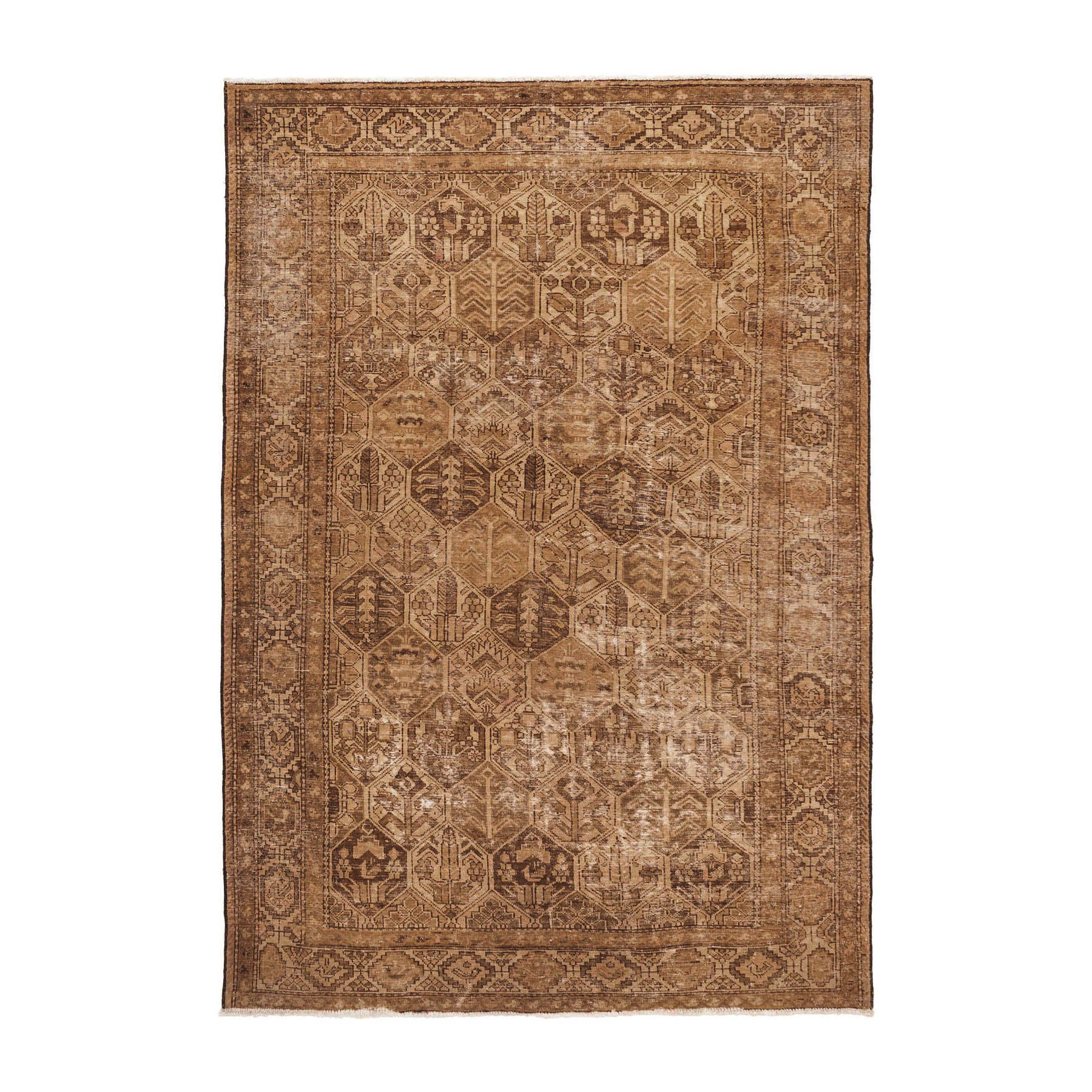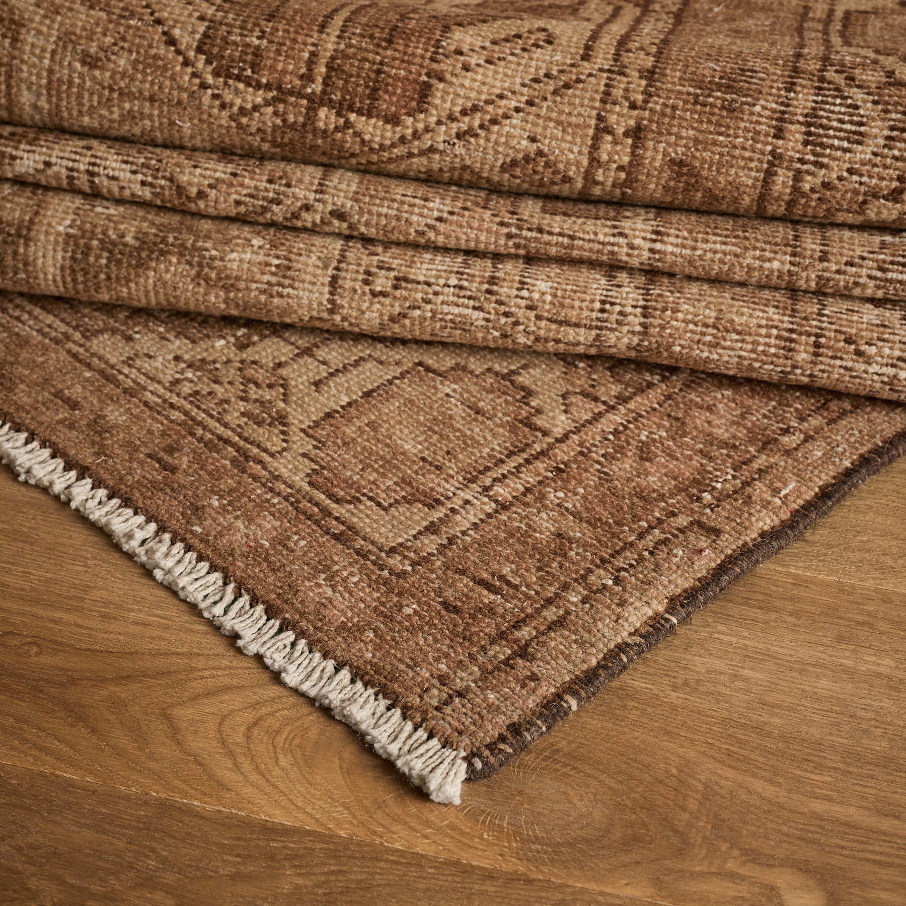 The Kahena Rug is a luxurious one-of-a-kind rug constructed from 100% Wool and a cotton foundation. Beautifully hand-knotted and made by local artisans, this rug with brown, tan, beige, dark brown and light khaki accents will bring warmth and refinement to any space.