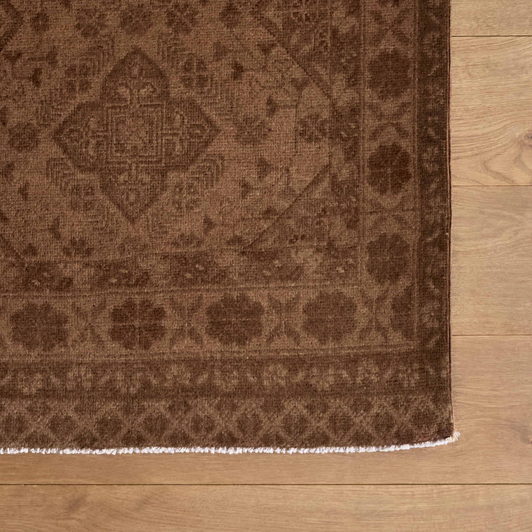 The Lewis Rug is a luxurious one-of-a-kind rug constructed from 100% wool and a cotton foundation. Beautifully hand-knotted and made by local artisans, this rug with brown accents will bring warmth and refinement to any space.
