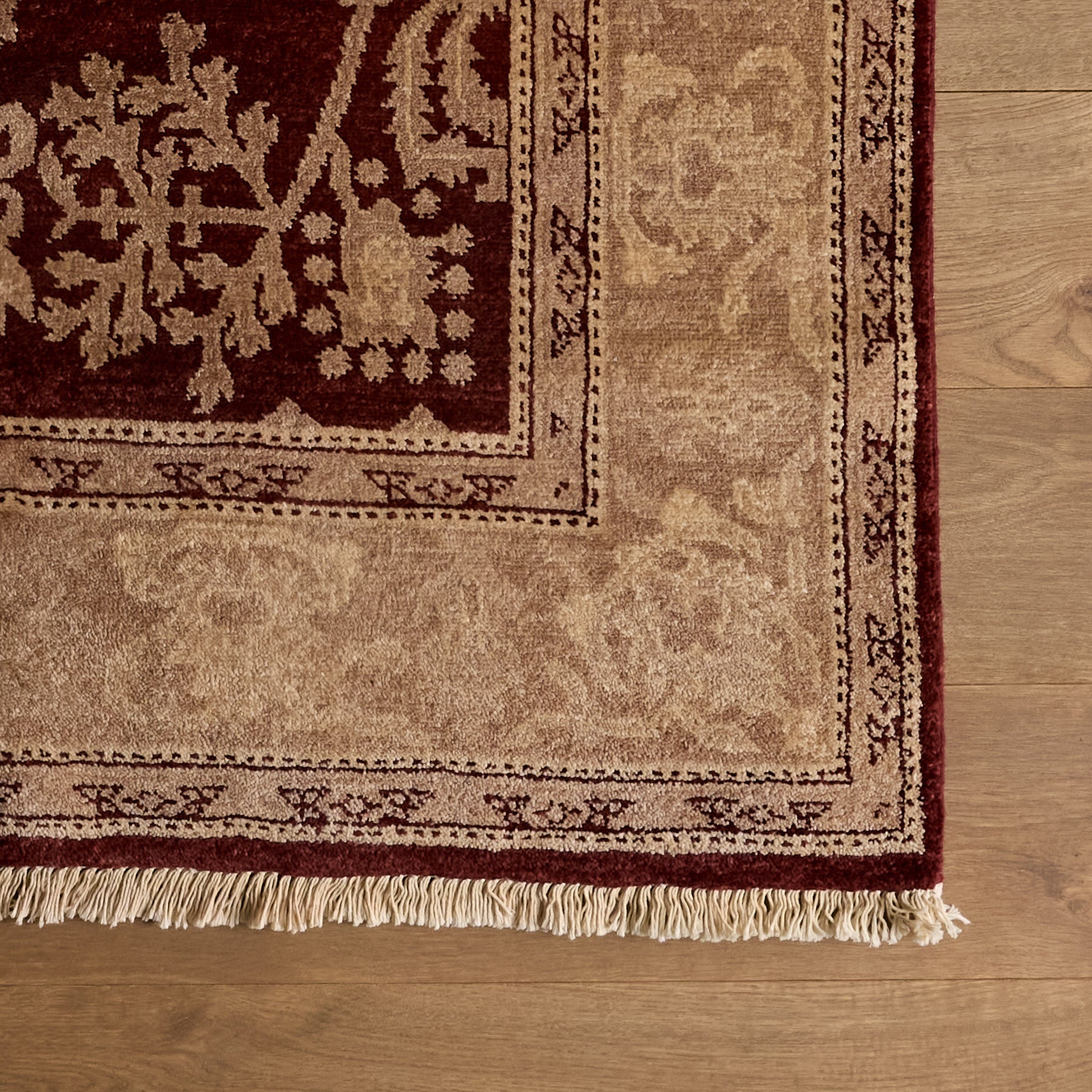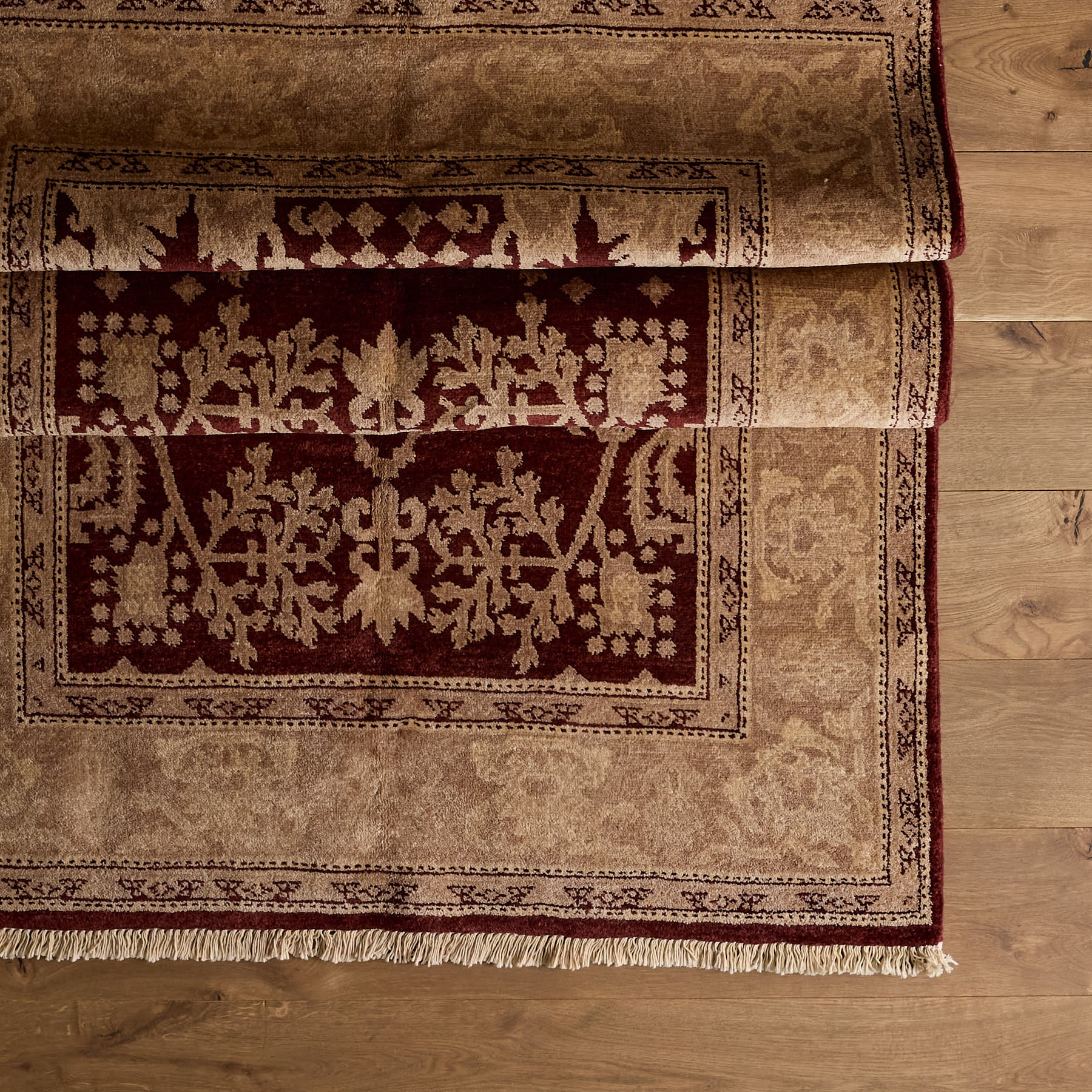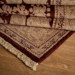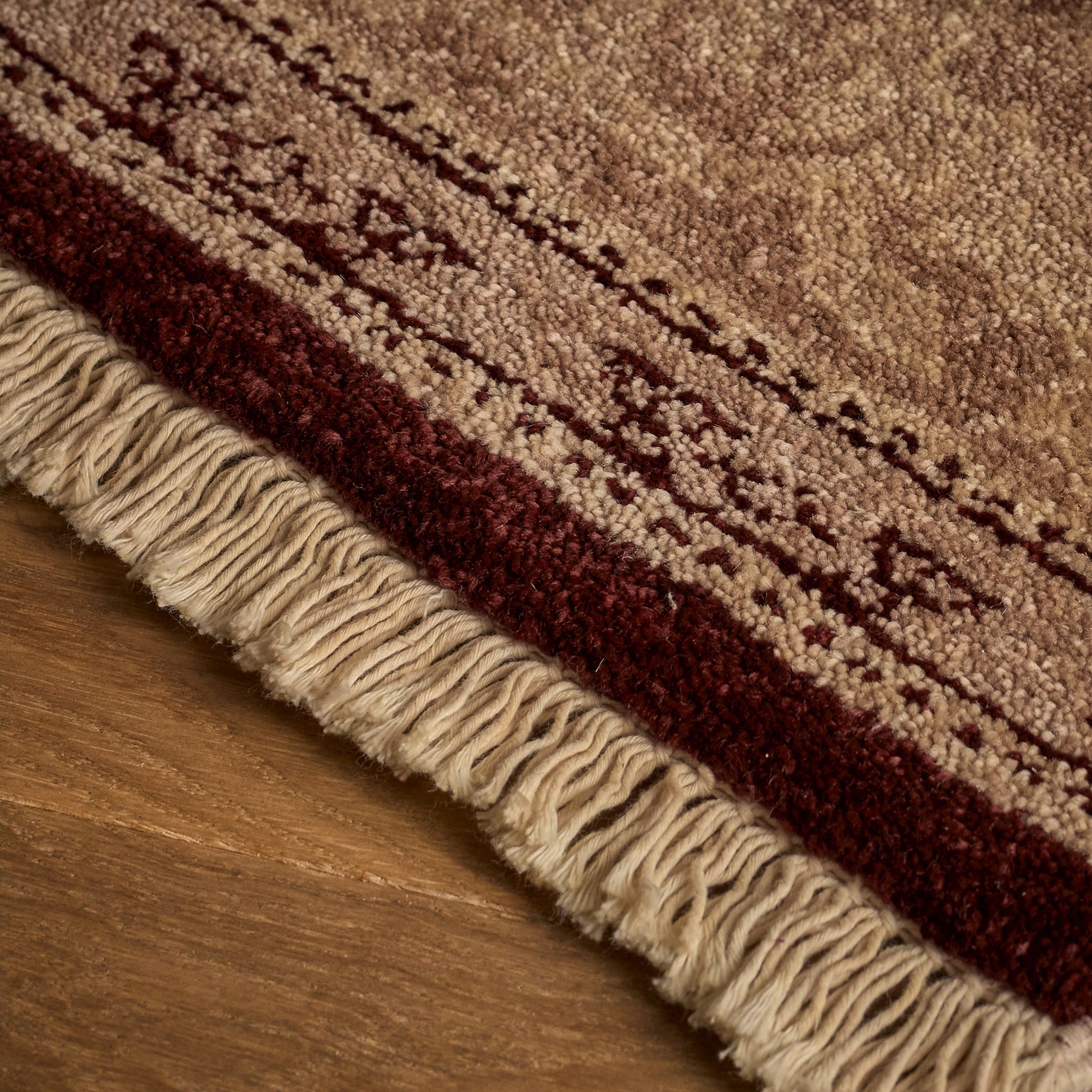 The Margrethe Rug is a luxurious one-of-a-kind rug constructed from 100% Wool and a cotton foundation. Beautifully hand-knotted and made by local artisans, this rug with burgundy, ivory, taupe and tan accents will bring warmth and refinement to any space.