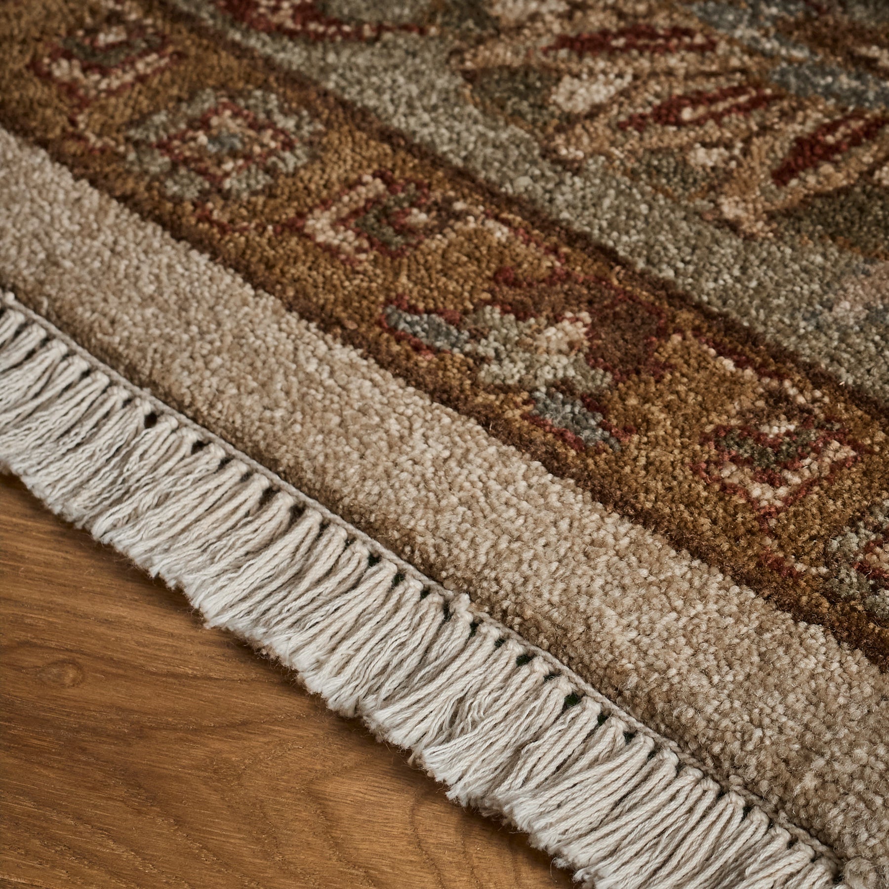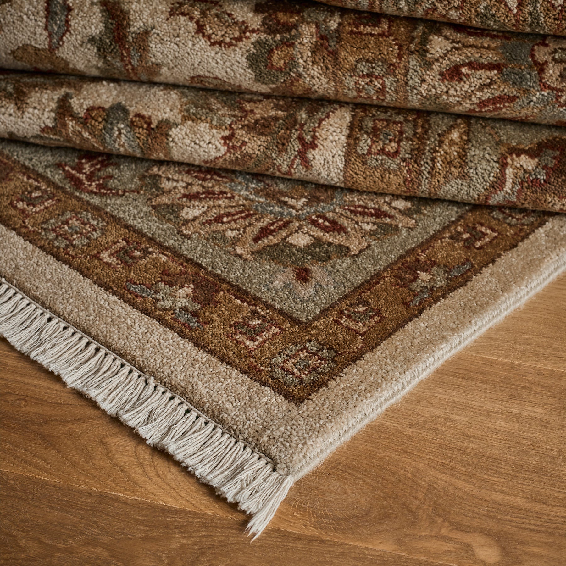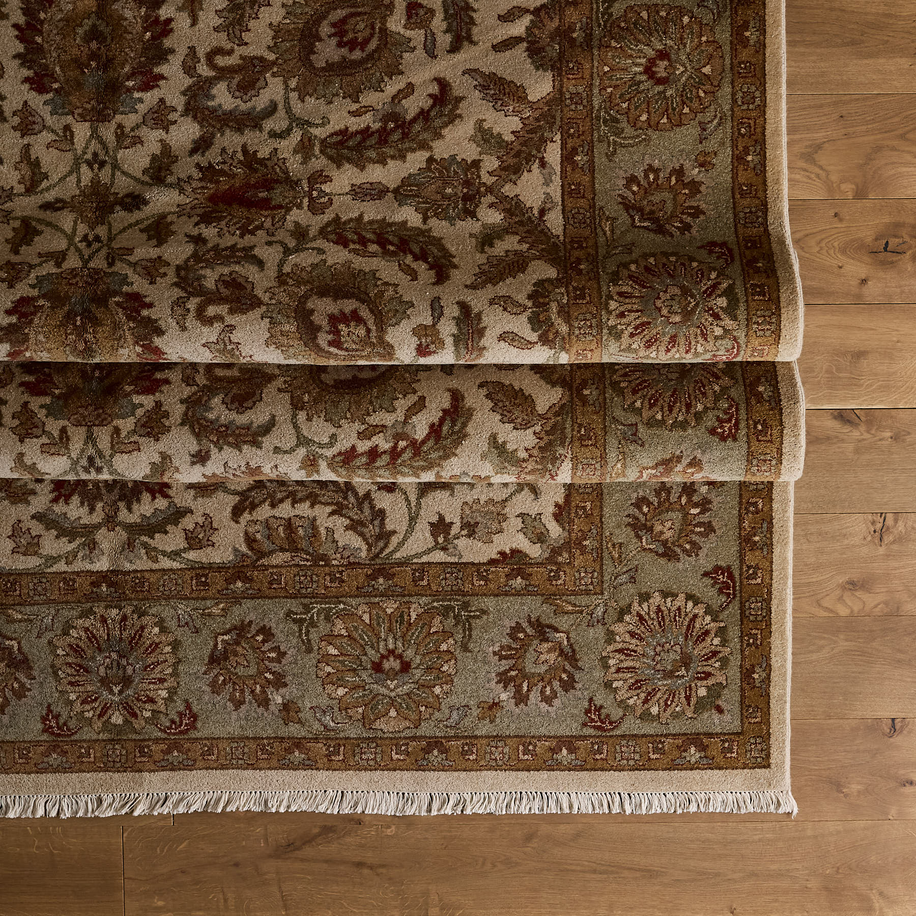 The Nathalia Rug is a luxurious one-of-a-kind rug constructed from 100% Wool and a cotton foundation. Beautifully hand-knotted and made by local artisans, this rug with ivory, light green, tan, brown, dark red and light grey accents will bring warmth and refinement to any space.