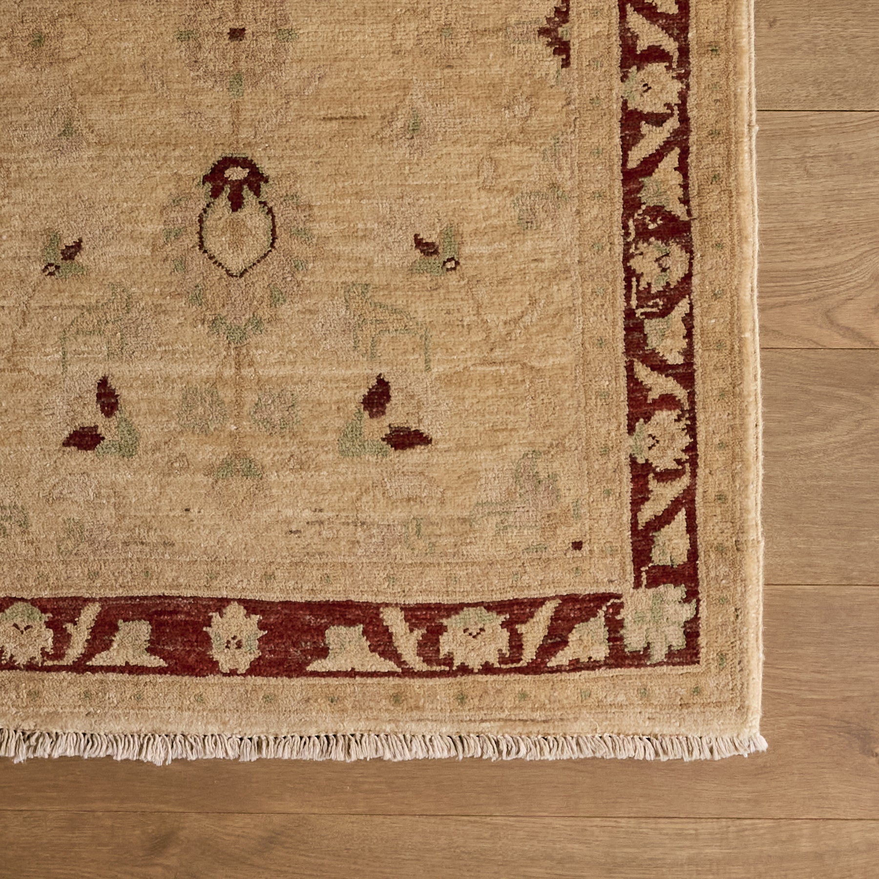 The Romy Rug is a luxurious one-of-a-kind rug constructed from 100% Wool and a cotton foundation. Beautifully hand-knotted and made by local artisans, this rug with ivory, beige, ocher, dark red and light green accents will bring warmth and refinement to any space.