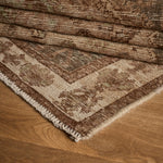 The Rosamund Rug is a luxurious one-of-a-kind rug constructed from 100% Wool and a cotton foundation. Beautifully hand-knotted and made by local artisans, this rug with tan, brown, beige, ivory, dark grey, light blue, accents will bring warmth and refinement to any space.