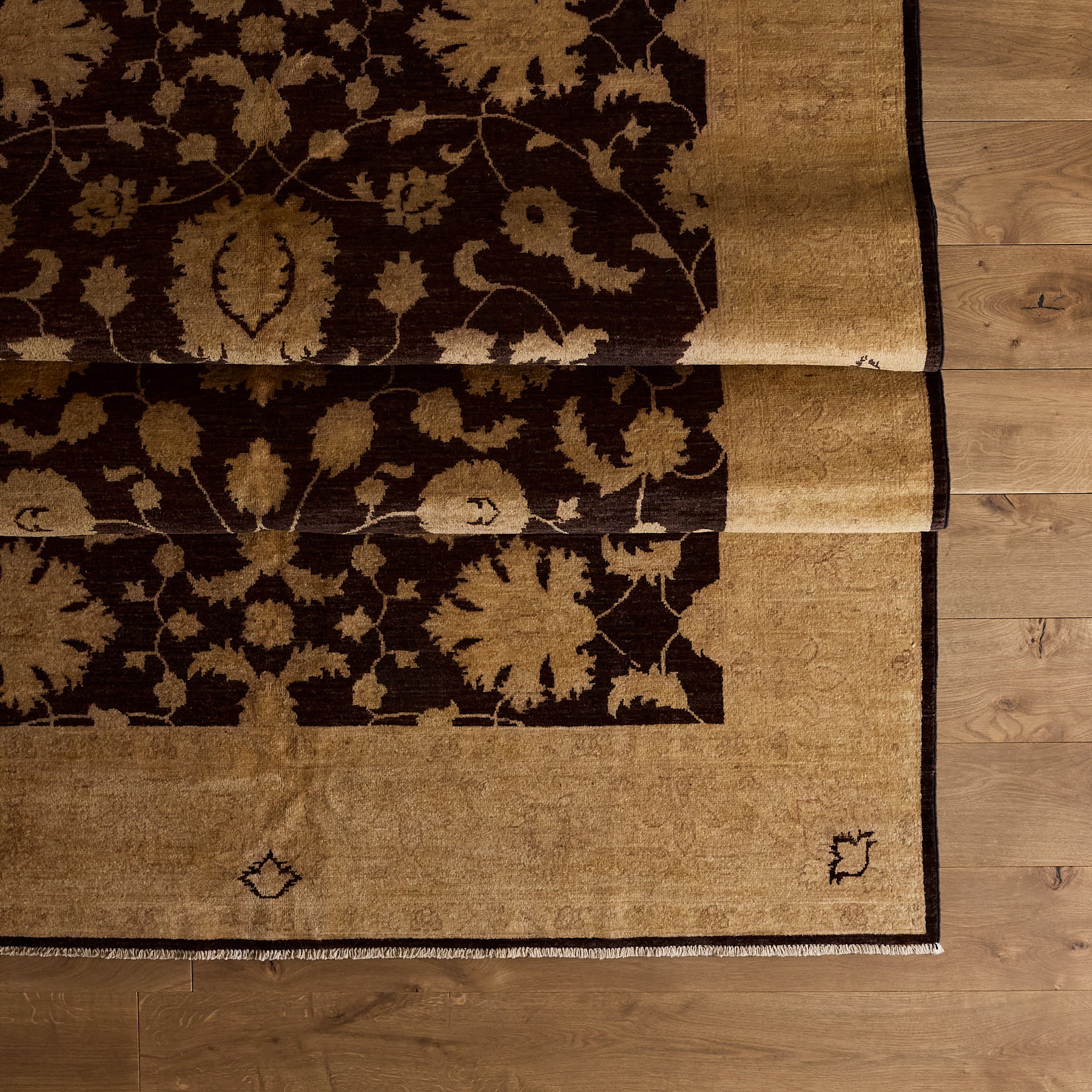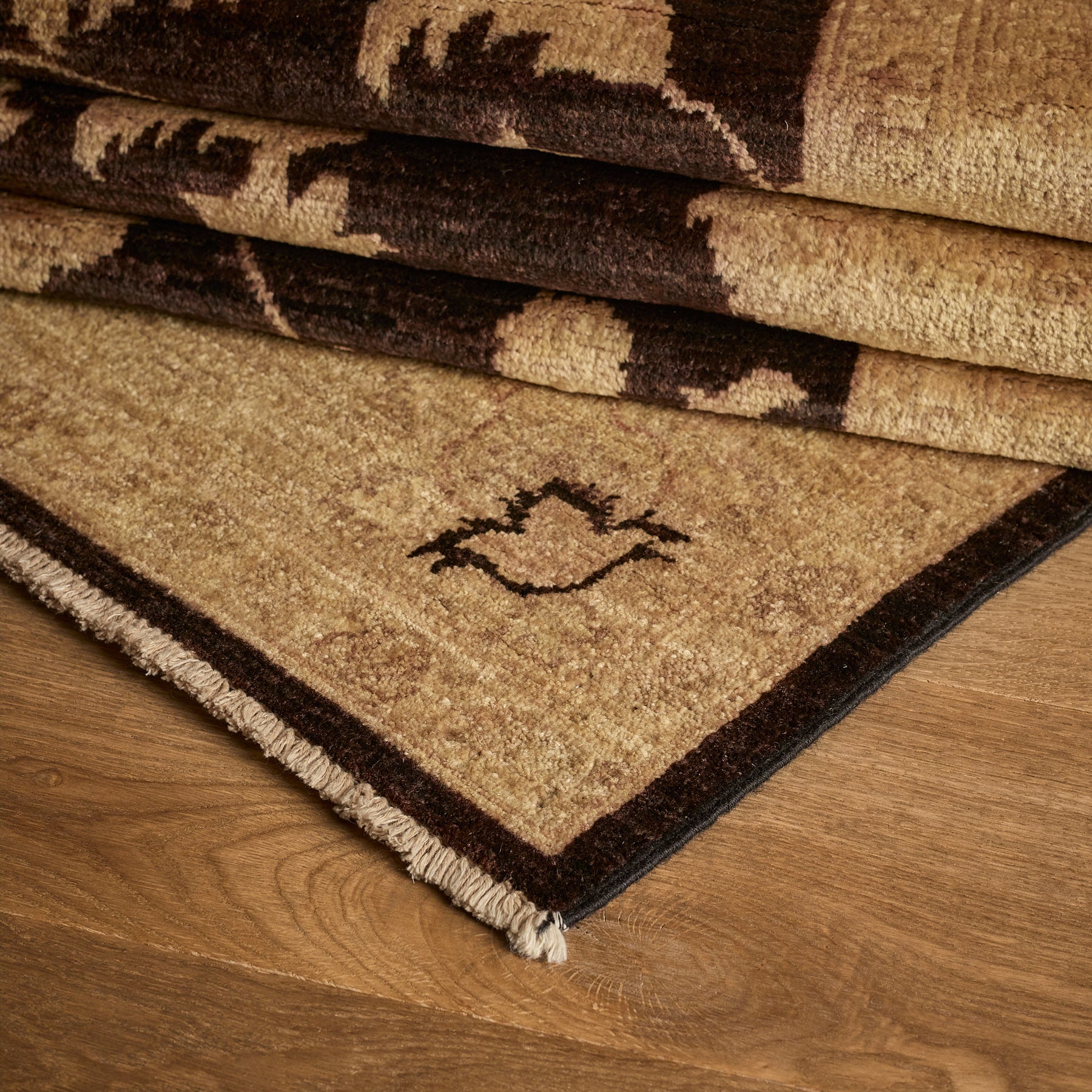 The Sacha Rug is a luxurious one-of-a-kind rug constructed from 100% Wool and a cotton foundation. Beautifully hand-knotted and made by local artisans, this rug with brown, black, tan, beige and khaki accents will bring warmth and refinement to any space.