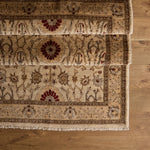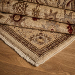 The Solene Rug is a luxurious one-of-a-kind rug constructed from 100% Wool and a cotton foundation. Beautifully hand-knotted and made by local artisans, this rug with ivory, beige, taupe, brown, dark red, light grey and light khaki accents will bring warmth and refinement to any space.