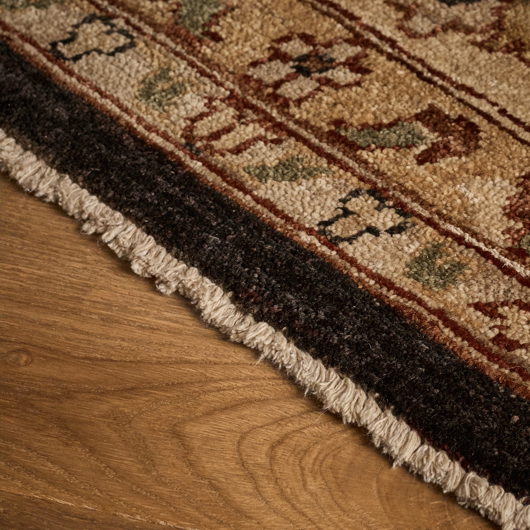 The Thais Rug is a luxurious one-of-a-kind rug constructed from 100% Wool and a cotton foundation. Beautifully hand-knotted and made by local artisans, this rug with dark navy, ivory, beige, tan, dark red, green, copper, burnt orange and brown accents will bring warmth and refinement to any space.