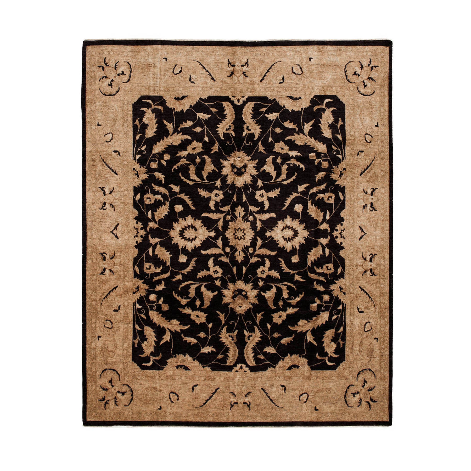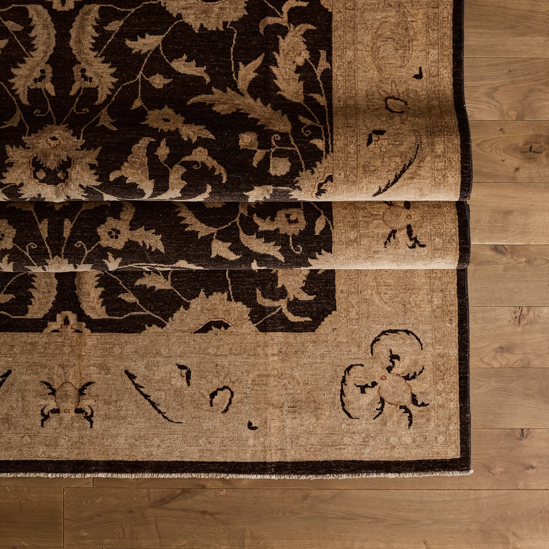 The Vincenzo Rug is a luxurious one-of-a-kind rug constructed from 100% Wool and a cotton foundation. Beautifully hand-knotted and made by local artisans, this rug with brown, tan, beige, ocher, light copper, light blue and dark red accents will bring warmth and refinement to any space.