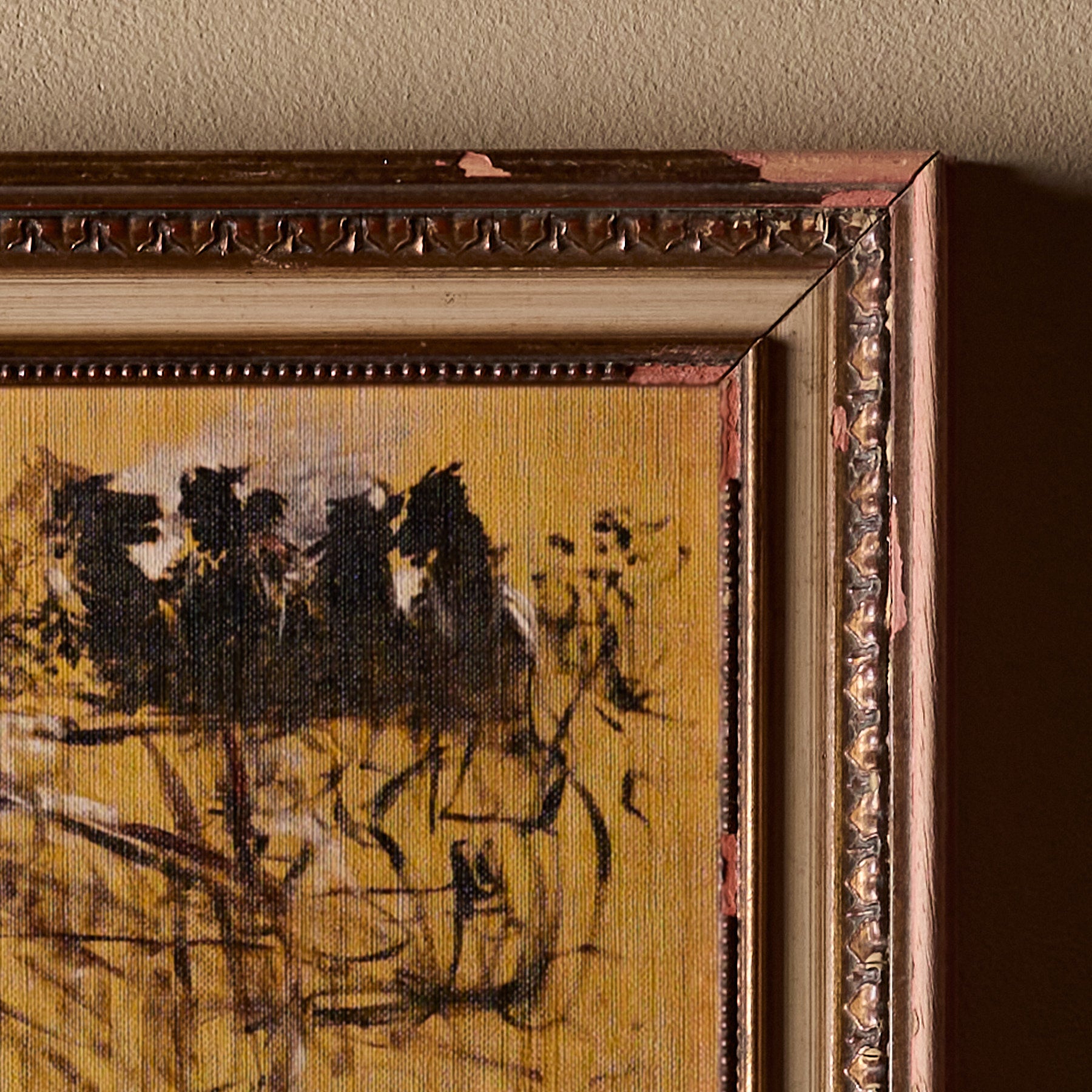 The frames themselves are 100% vintage. However, the canvas inside features a new print. We carefully curate artworks from various artists and pair them with vintage frames to create a unique and beautiful piece of art. Each composition is handmade.