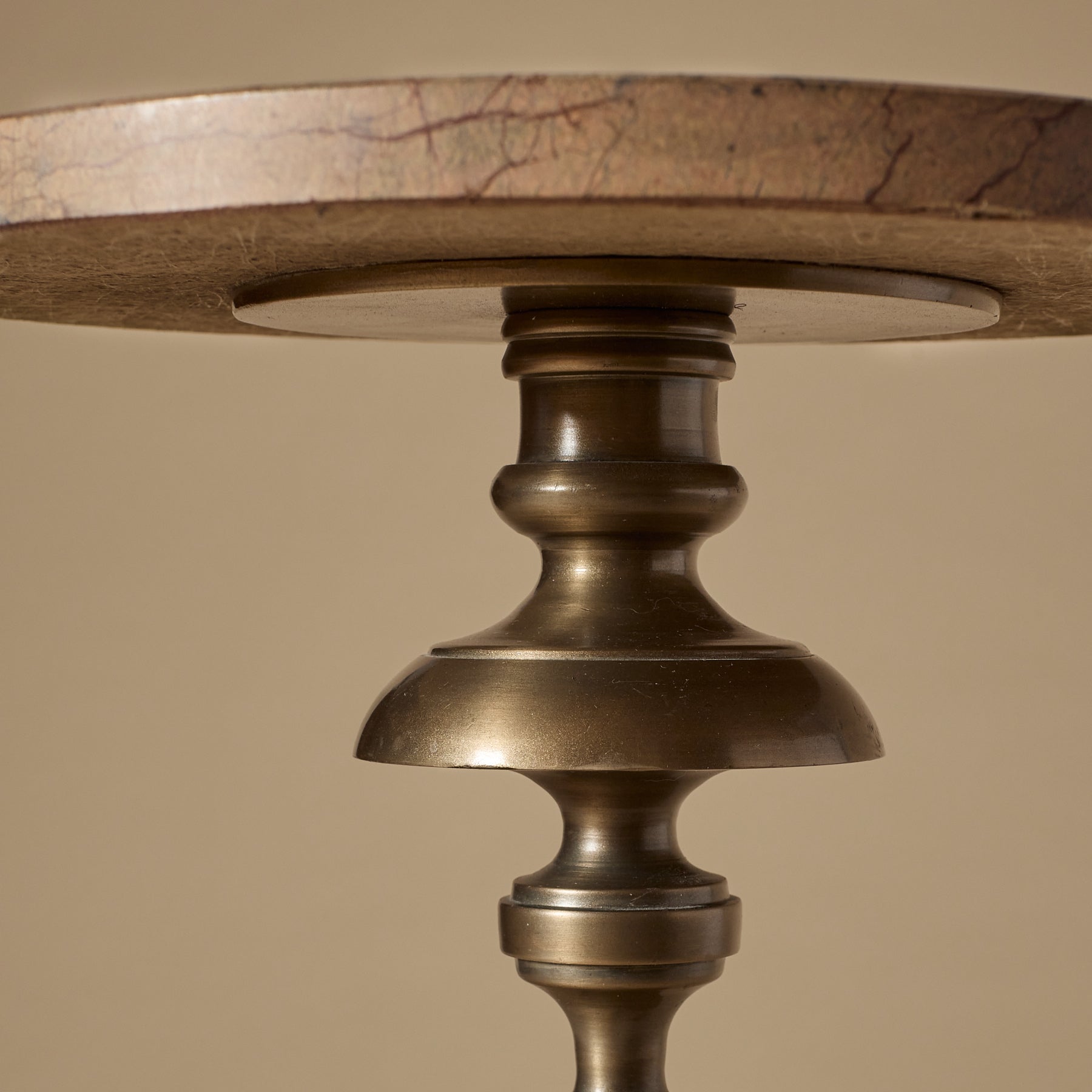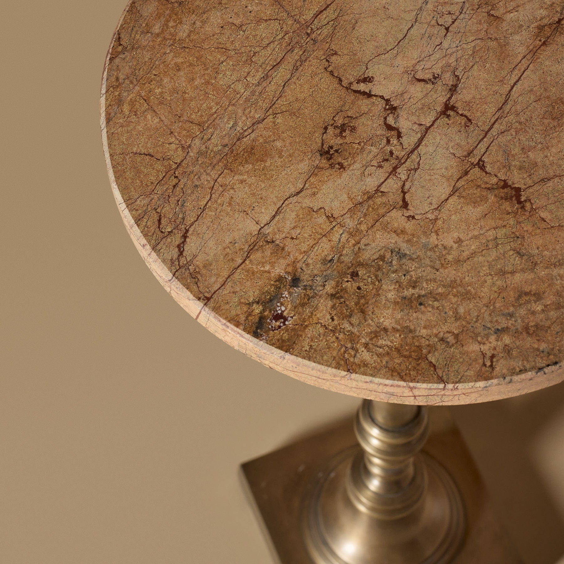 * The brass elements display a rich patina with subtle marks and areas of oxidation throughout. The marble top shows gentle surface wear and natural veining consistent with age.