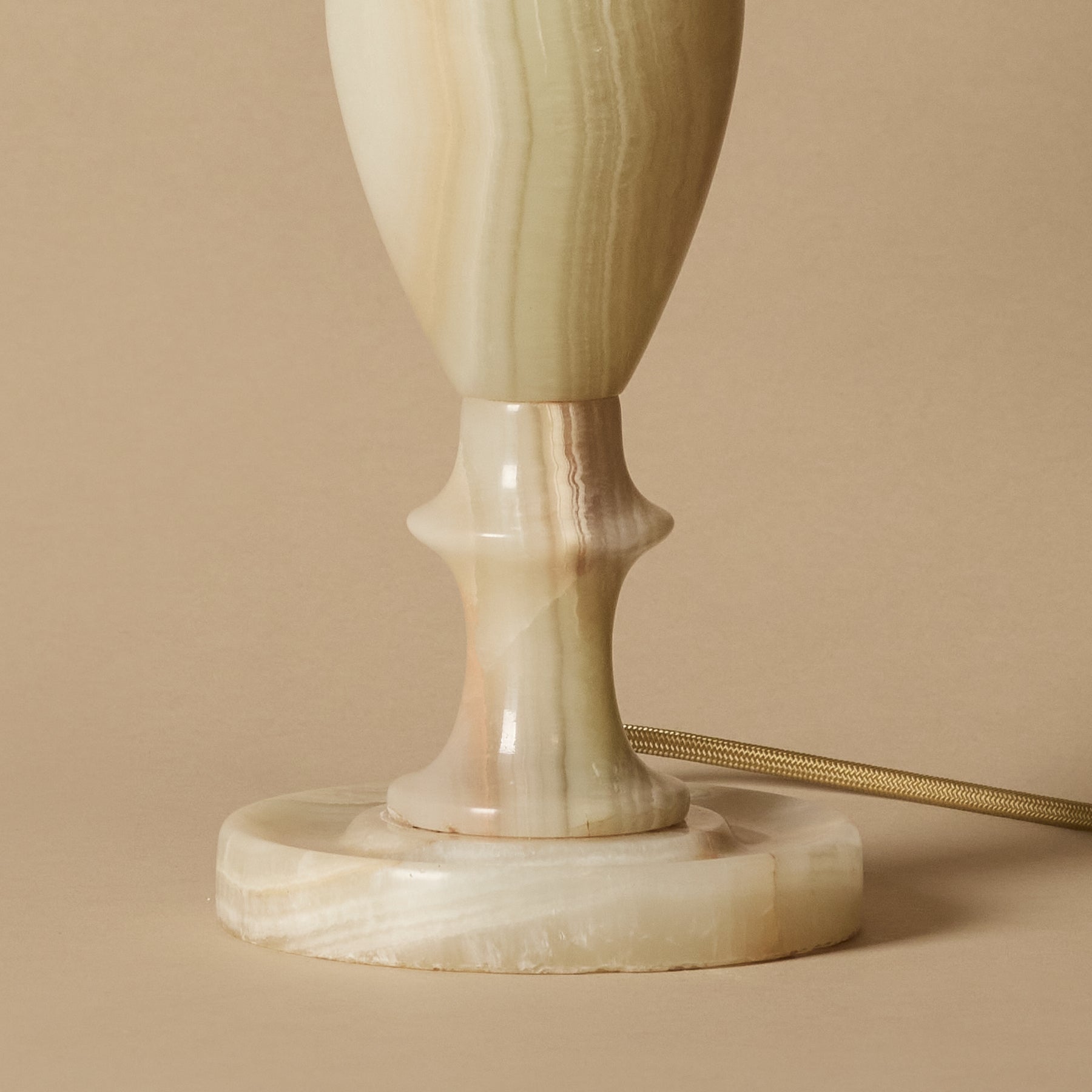 * There is edge wear along the bottom of the base, accompanied by mild pitting and scattered surface marks. Slight discolouration is visible around the joined onyx sections, and natural onyx variations are present throughout.