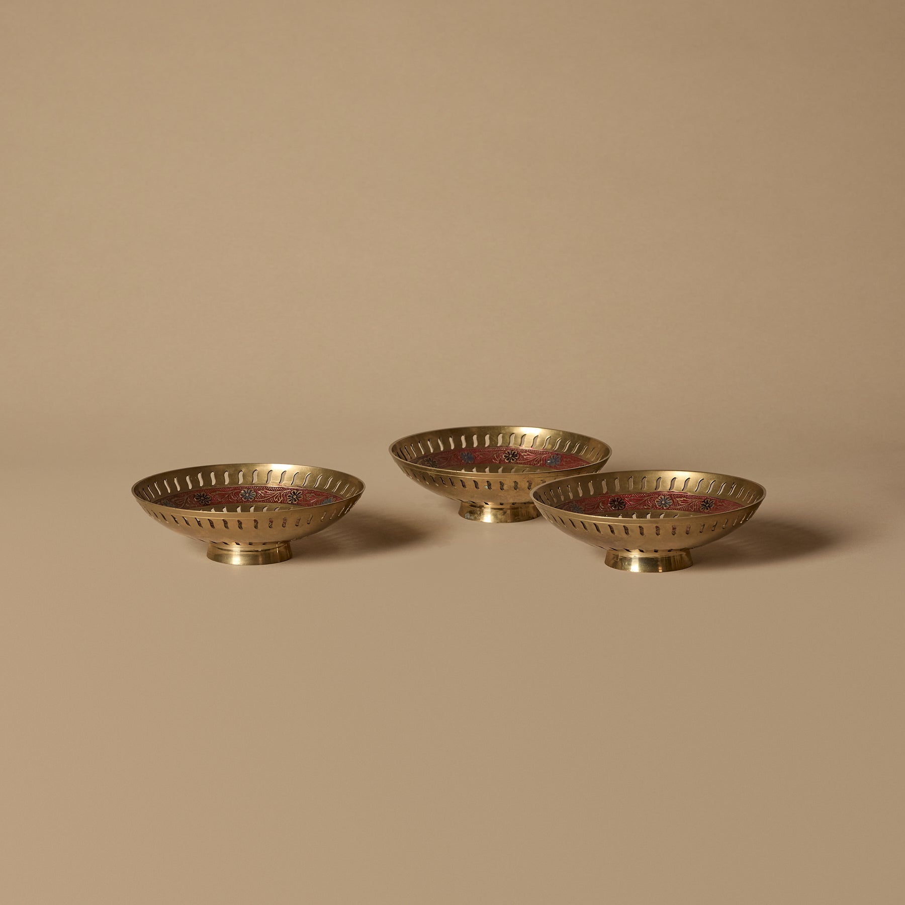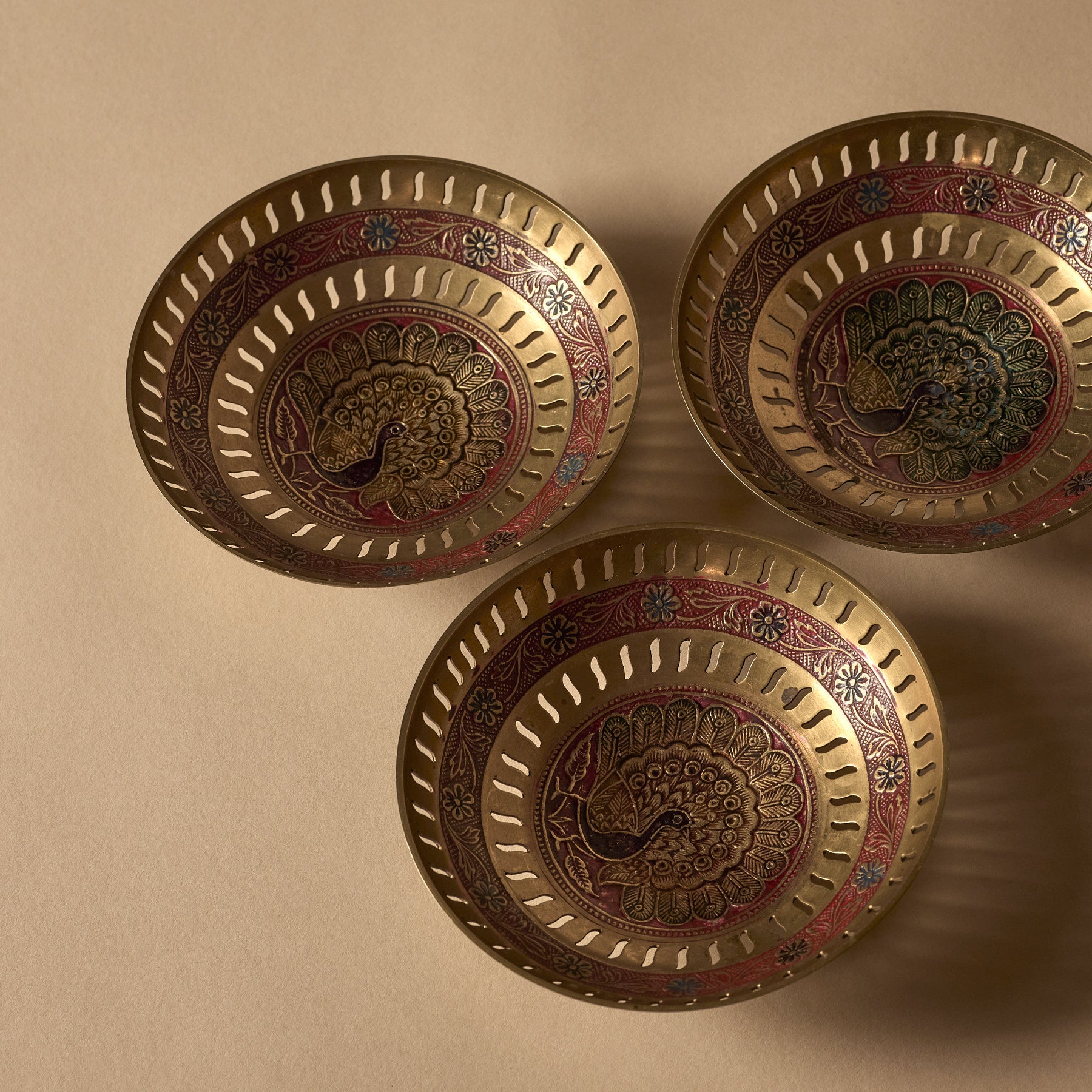 Set of Three Vintage Brass Enameled Peacock Bowls