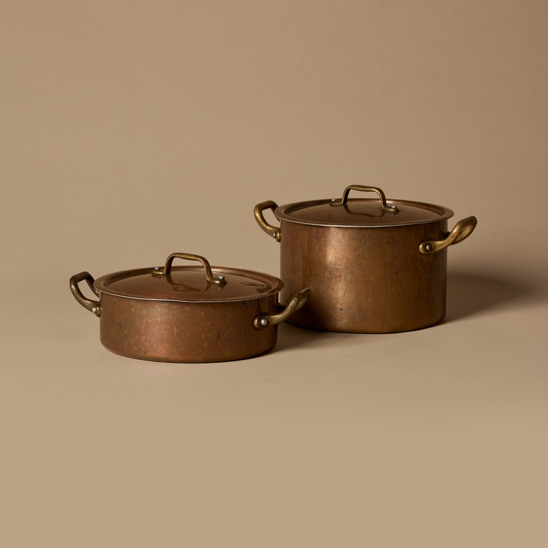 * The exterior of the pots display a rich patina with areas of tarnish, spotting, and surface wear consistent with age and use. The interior is lined in tin or aluminum, which shows general signs of use.