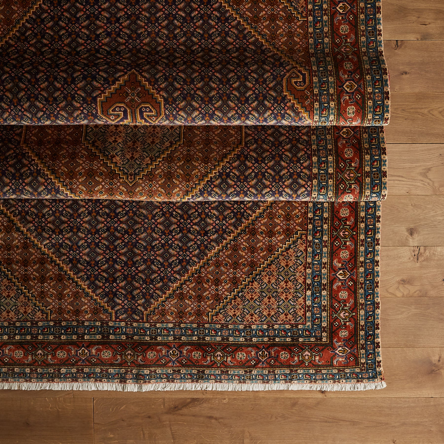 Le tapis Bea est un tapis luxueux et unique composé à 100% de laine et d'une base en coton. Magnifiquement noué à la main et fabriqué par des artisans locaux, ce tapis aux accents marine foncé, marron, cuivre, tan, bleu et saumon apportera chaleur et raffinement à tout espace.