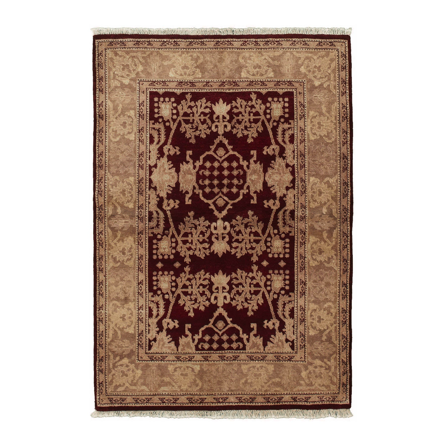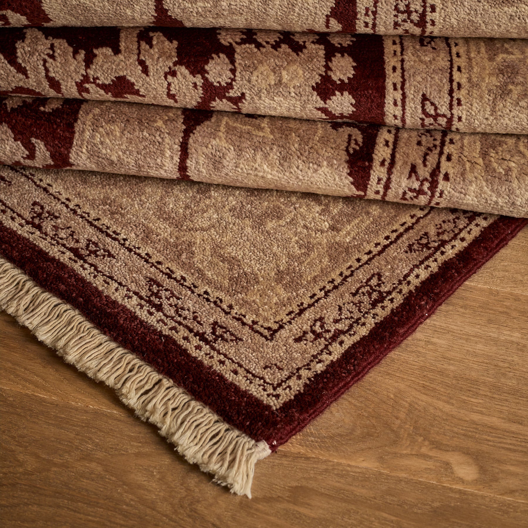 Le tapis Margrethe est un tapis luxueux et unique fabriqué à partir de 100% de laine et d'une base en coton. Magnifiquement noué à la main et fabriqué par des artisans locaux, ce tapis aux accents bordeaux, ivoire, taupe et tan apportera chaleur et raffinement à tout espace.