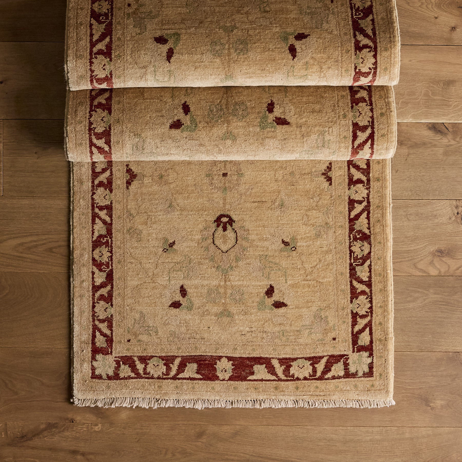 Le tapis Romy est un tapis luxueux et unique composé à 100% de laine et d'une base en coton. Magnifiquement noué à la main et fabriqué par des artisans locaux, ce tapis aux accents ivoire, beige, ocre, rouge foncé et vert clair apportera chaleur et raffinement à tout espace.