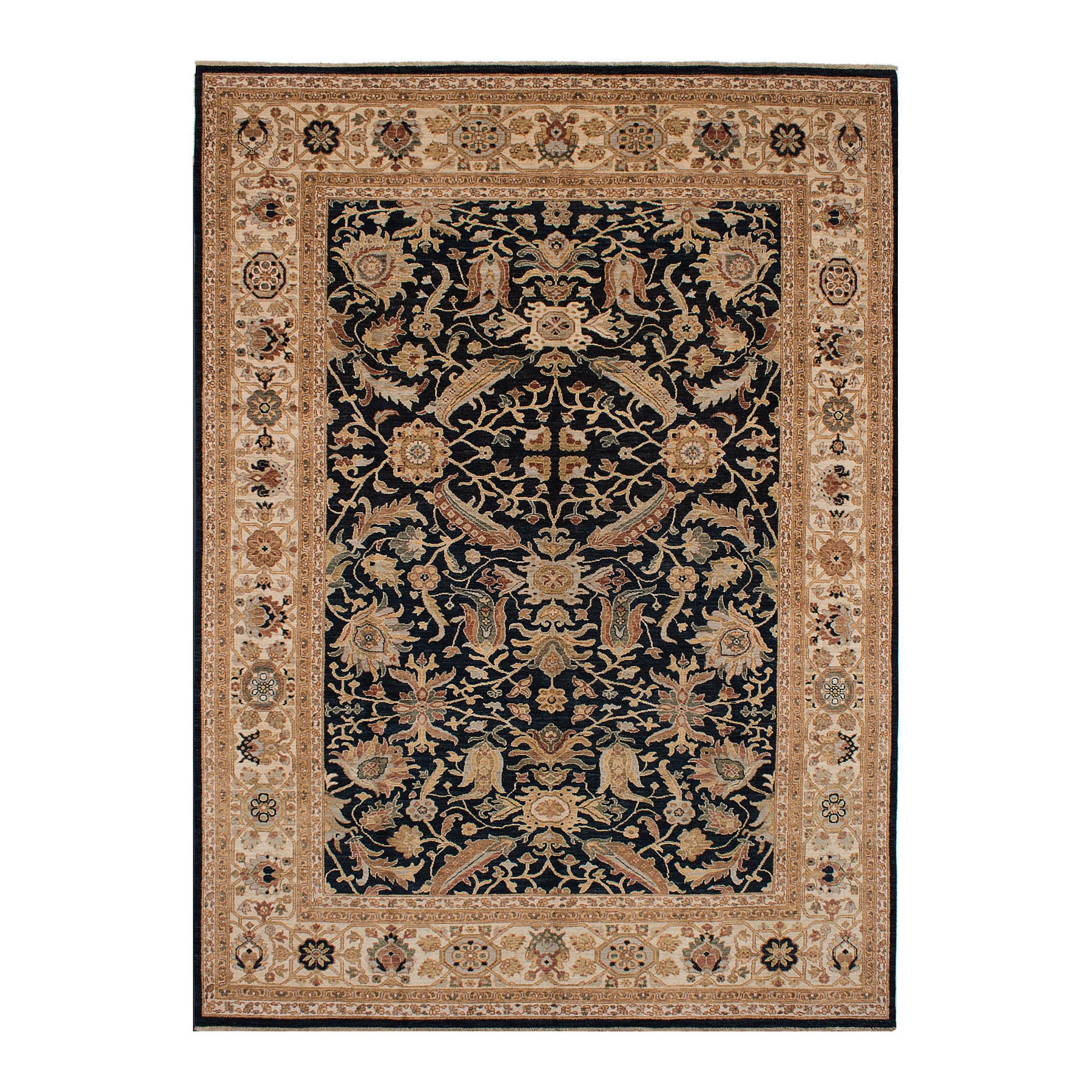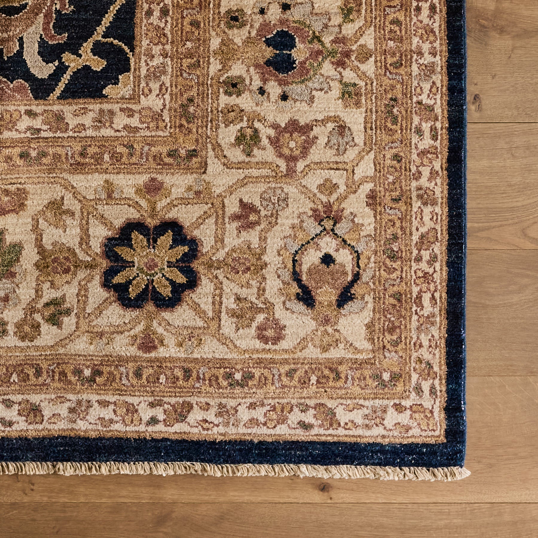 Le tapis Selma est un tapis luxueux et unique composé à 100% de laine et d'une base en coton. Magnifiquement noué à la main et fabriqué par des artisans locaux, ce tapis aux accents marine foncé, beige, tan, ocre, marron, cuivre, ivoire, kaki, vert clair et bleu clair apportera chaleur et raffinement à tout espace.