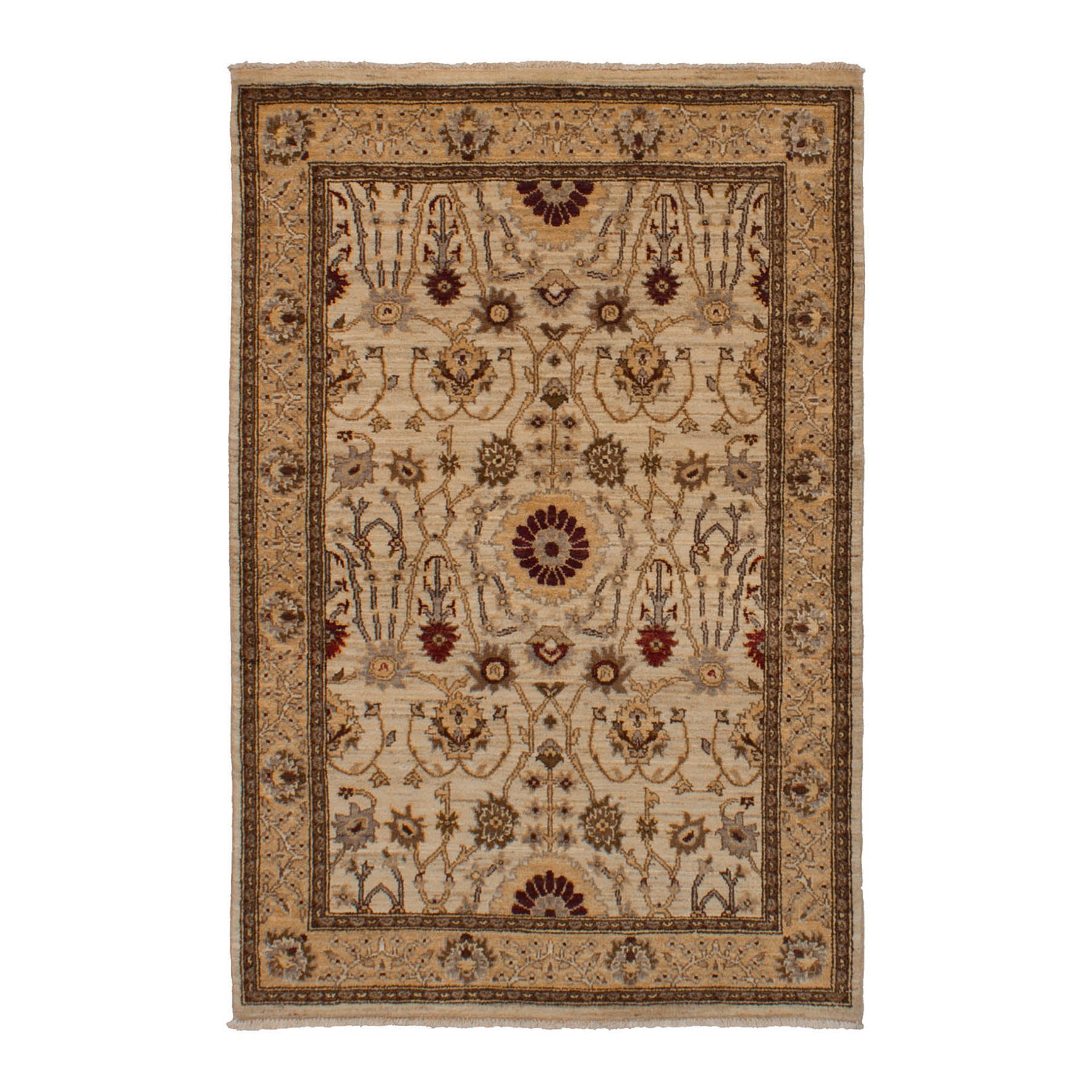 Le tapis Solene est un tapis luxueux et unique composé à 100% de laine et d'une base en coton. Magnifiquement noué à la main et fabriqué par des artisans locaux, ce tapis aux accents ivoire, beige, taupe, marron, rouge foncé, gris clair et kaki clair apportera chaleur et raffinement à tout espace.