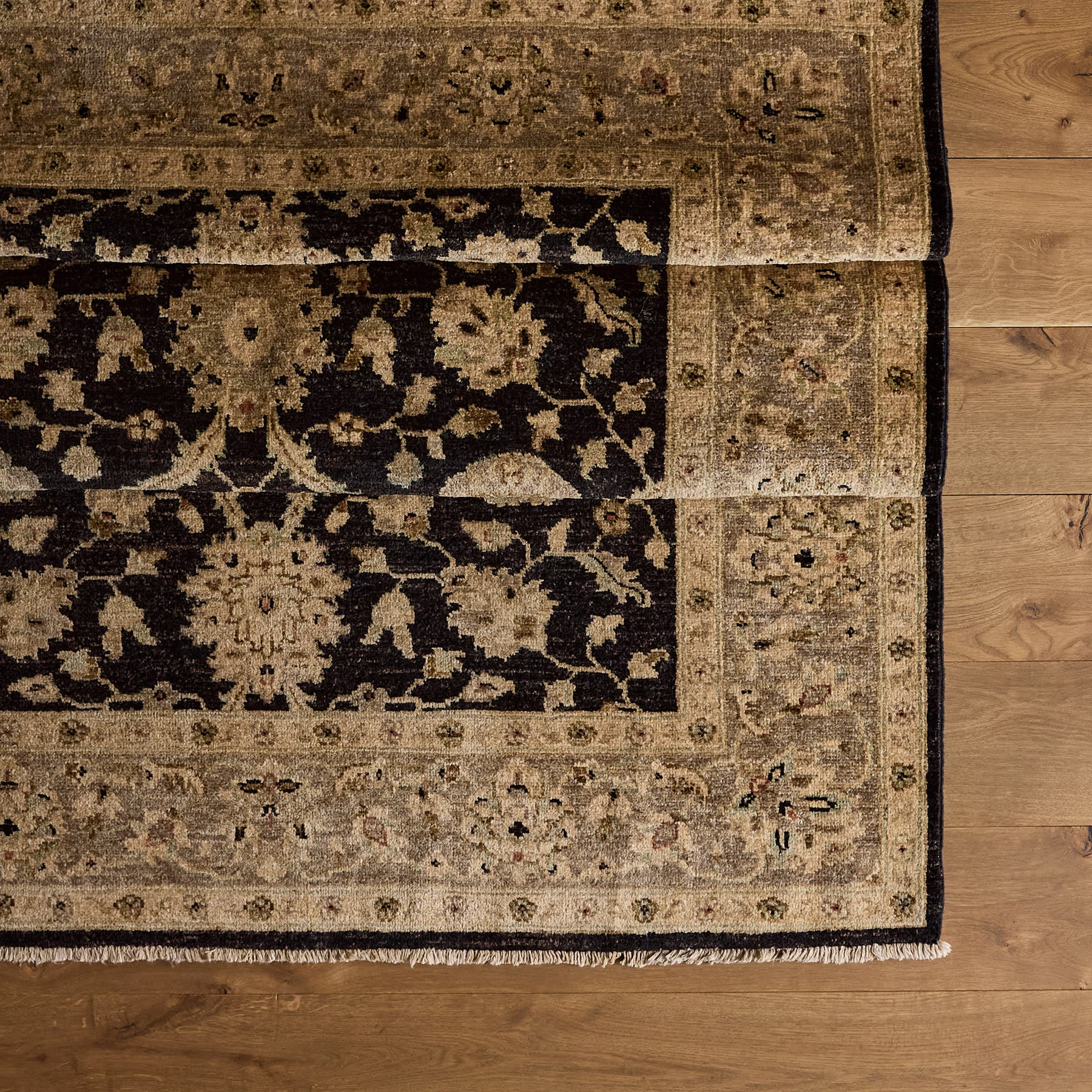 Le tapis Thurman est un tapis luxueux et unique composé à 100% de laine et d'une base en coton. Magnifiquement noué à la main et fabriqué par des artisans locaux, ce tapis aux accents noirs, gris clair, ivoire, marron et cuivre foncé apportera chaleur et raffinement à tout espace.