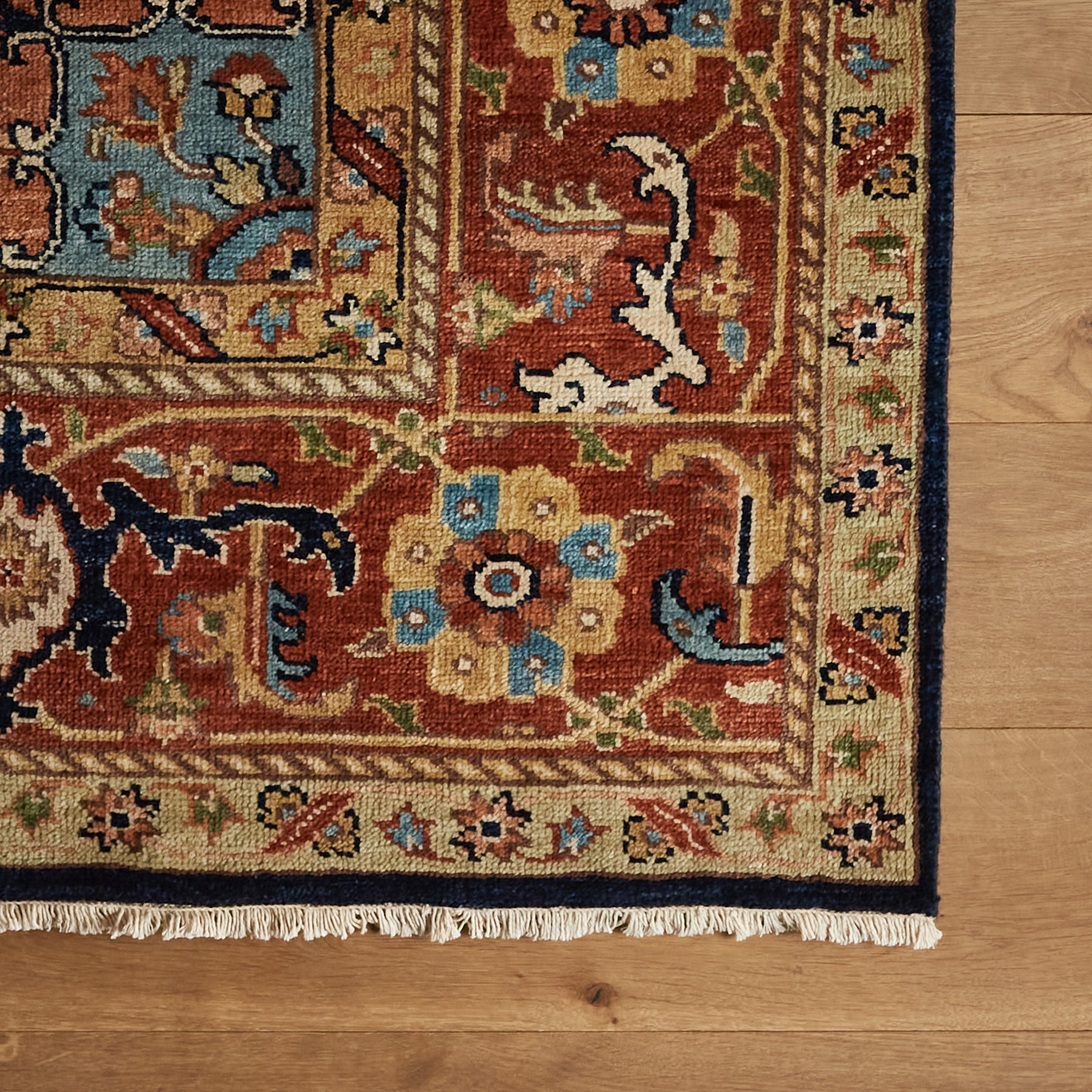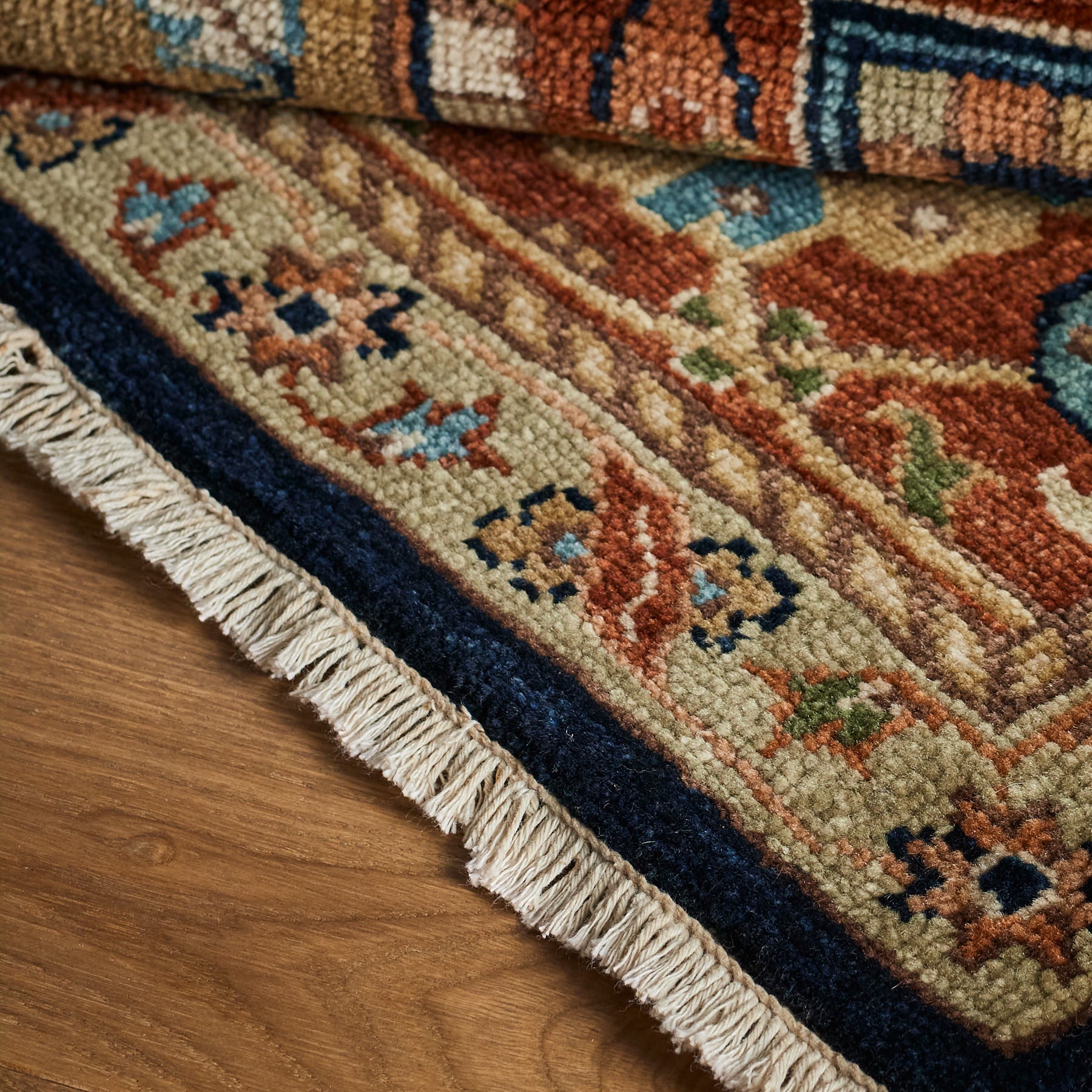 Le tapis Timmy est un tapis luxueux et unique composé à 100% de laine et d'une base en coton. Magnifiquement noué à la main et fabriqué par des artisans locaux, ce tapis aux accents cuivre foncé, marron, cuivre, tan, beige, marine foncé, khaki et bleu clair apportera chaleur et raffinement à tout espace.