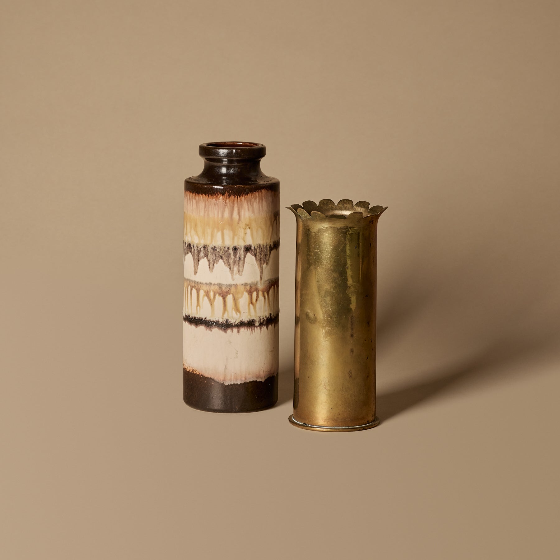 * Le vase en céramique présente une légère usure de surface avec de subtiles irrégularités de glaçure et des variations naturelles de tonalité. Le vase en laiton présente des zones ternies, des éraflures mineures et des marques assombries, avec un vert-de-gris visible et une légère corrosion à l'intérieur et sur le bord supérieur. Il y a également une petite bosse. La base du vase en laiton est estampillée "Patronenfabrik Karlsruhe 1917".