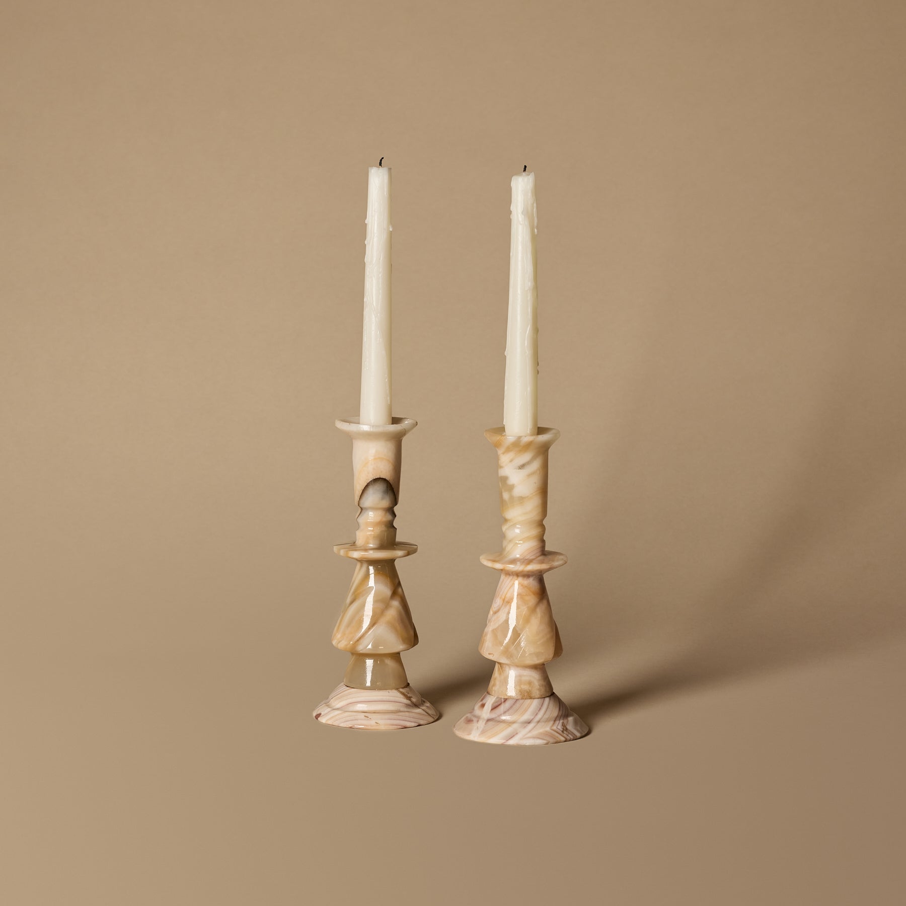 * Les deux bougeoirs présentent des variations naturelles de couleur et de veinage de l'onyx, avec une usure de surface mineure et des marques légères. De Petit éclats et des aspérités sont présents le long de certains bords, en particulier au niveau des bases. Chaque bougeoir est légèrement incliné en raison de sa forme sculptée à la main, mais les deux restent stables et s'exposent bien.