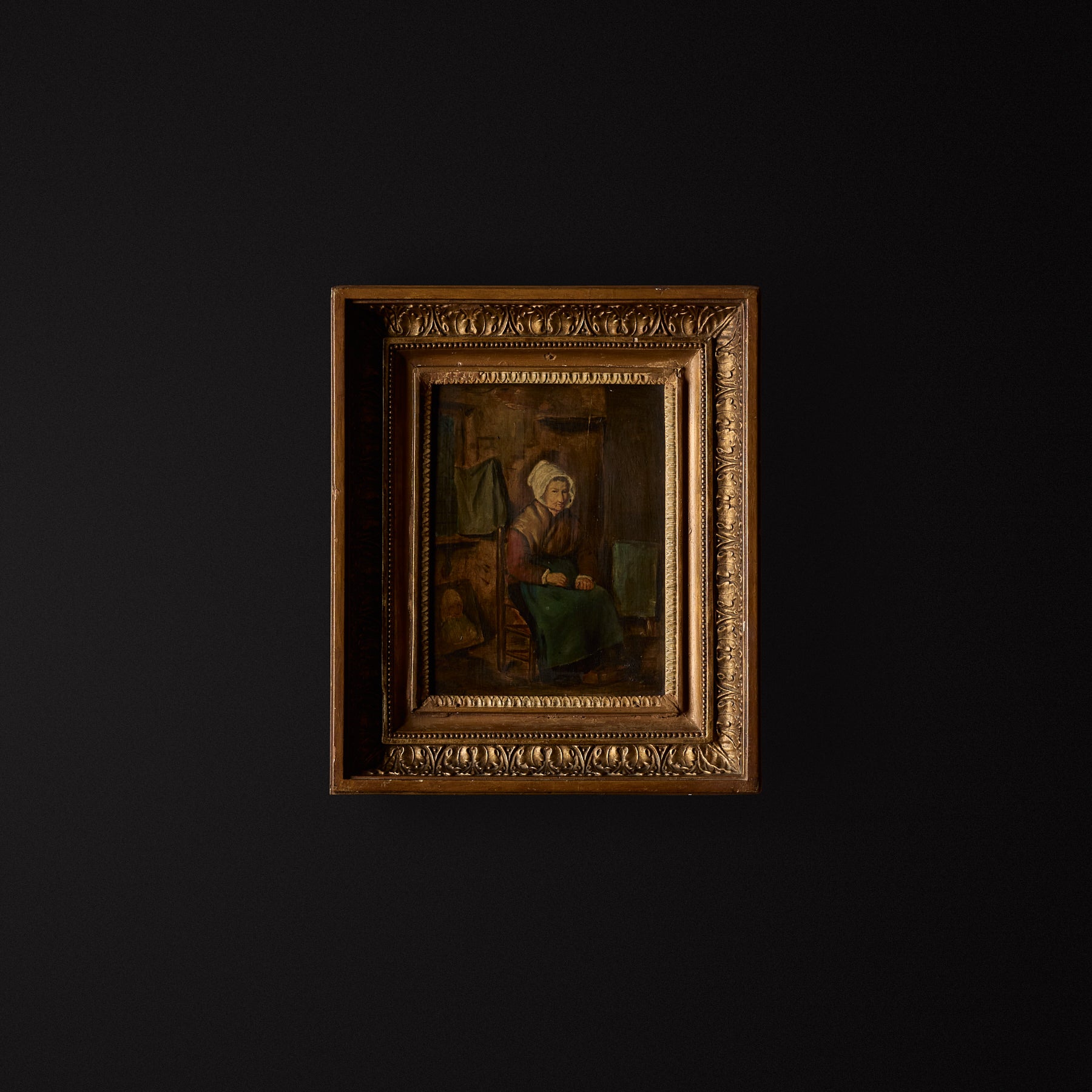 Peinture à l’huile du début du XXe siècle d'une femme dans une chambre à linge