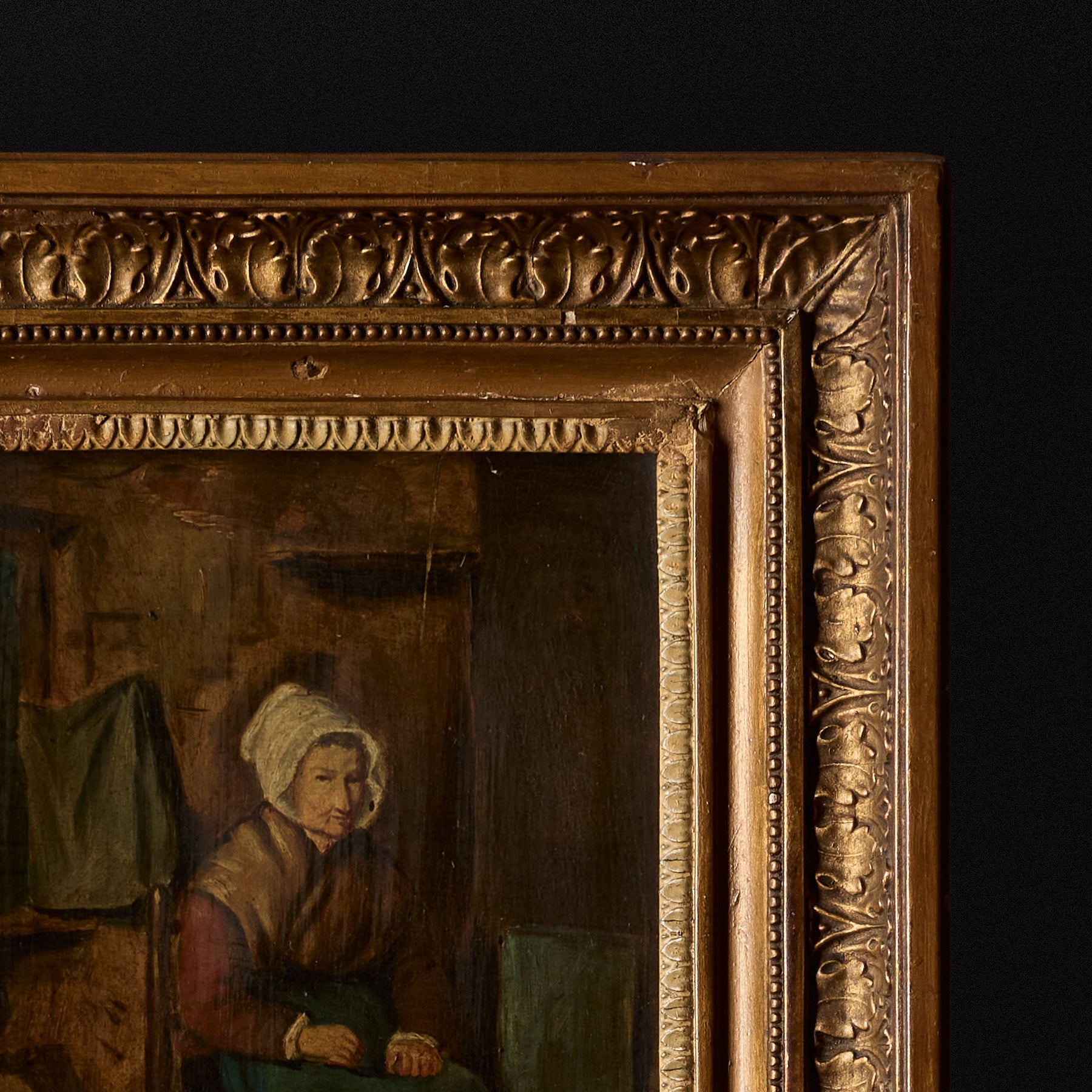 * La peinture présente de légères craquelures stables, avec quelques petites zones de perte de peinture le long des bords. Le cadre est structurellement sain, mais montre des écailles et une usure de surface révélant le gesso et le bois en dessous. On note également des éclats plus importants le long du haut et du dos du cadre, invisibles une fois l’œuvre accrochée.