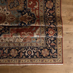 Le tapis Telestos est un tapis luxueux et unique composé à 100% de laine et d'une base en coton. Magnifiquement noué à la main et fabriqué par des artisans locaux, ce tapis aux accents cuivre, cuivre foncé, marine foncé, ivoire, kaki et bleu apportera chaleur et raffinement à tout espace.