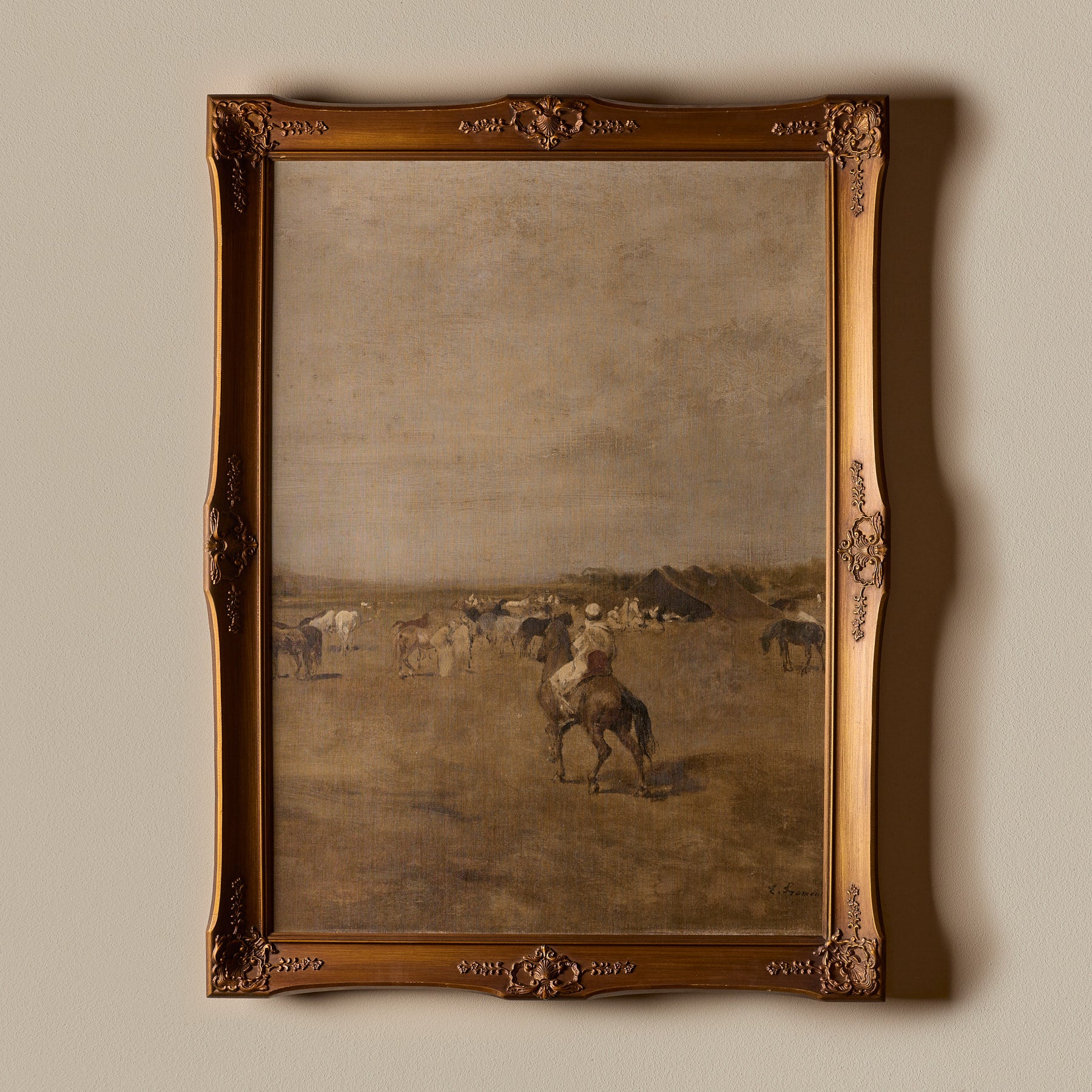 Nomades est une œuvre d'art murale unique montée à la main, composée d'un cadre en bois massif et d'une toile imprimée. Soigneusement sélectionné par notre équipe, Nomades présente un encadrement vintage et une toile neuve représentant une œuvre d'art classique, mêlant l'ancien et le nouveau pour créer une composition magistrale.