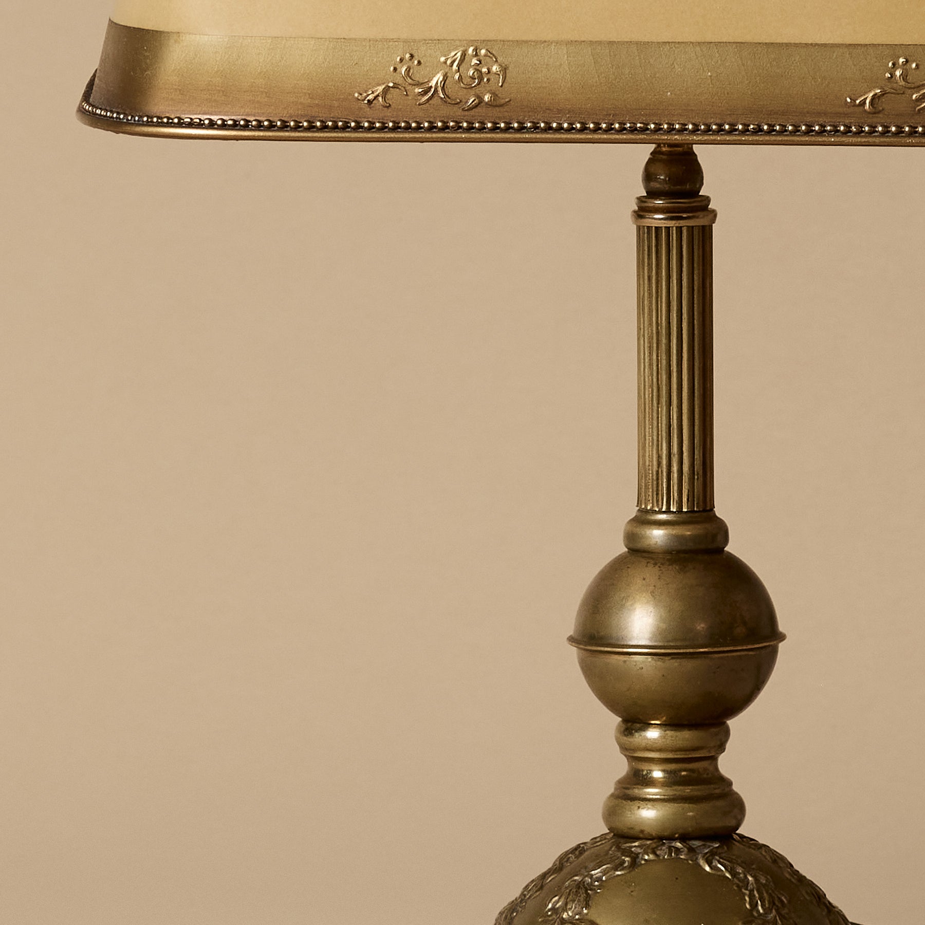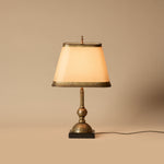 * La base de la lampe présente une certaine usure des bords, révélant le ton de la pierre en dessous. Les éléments en laiton ont une belle patine vieillie avec des marques sombres et des variations de tons. L'abat-jour est en très vintage état, avec un léger renfoncement sur le bord inférieur arrière dû à l'âge, et présente une finition cirée à l'éclat chaud.