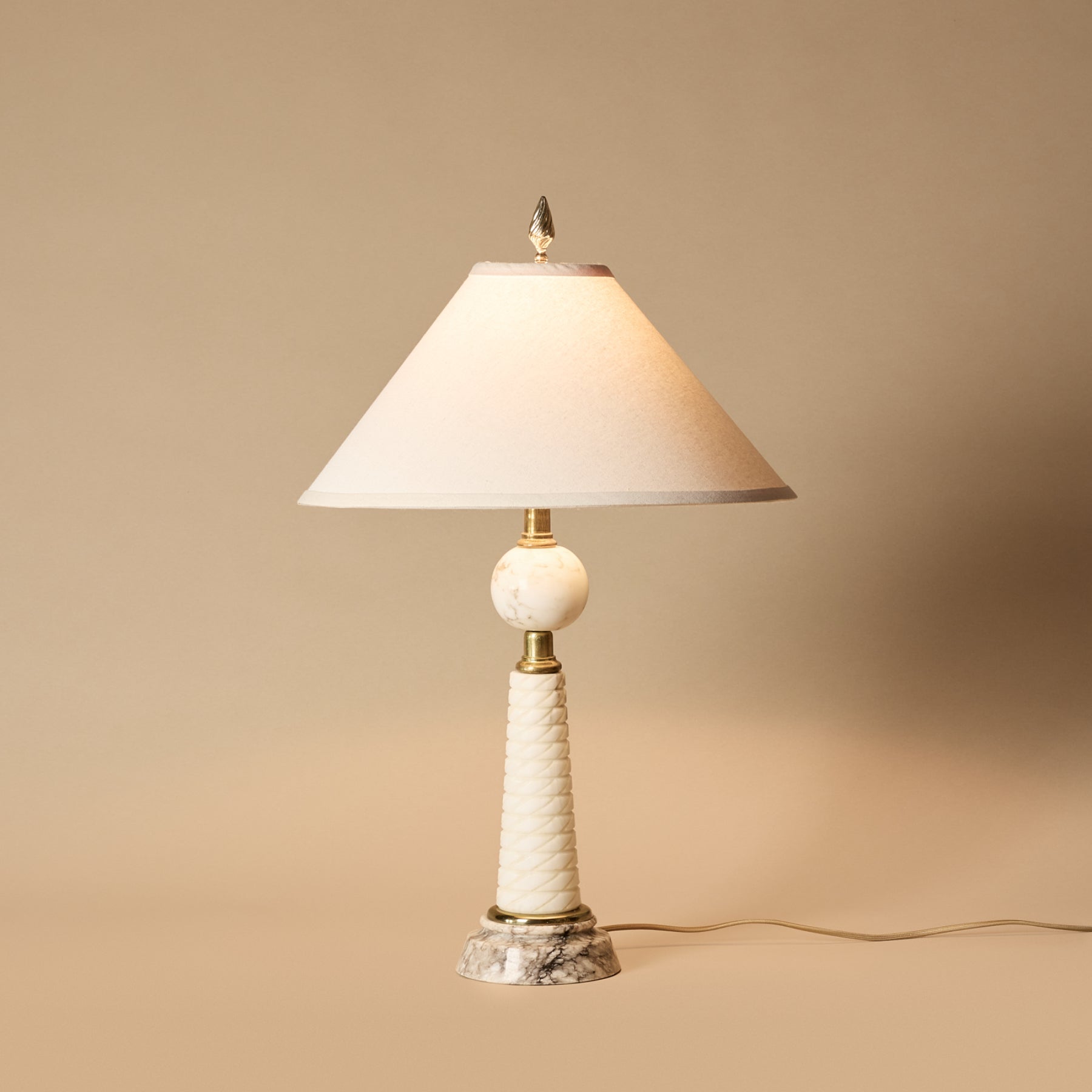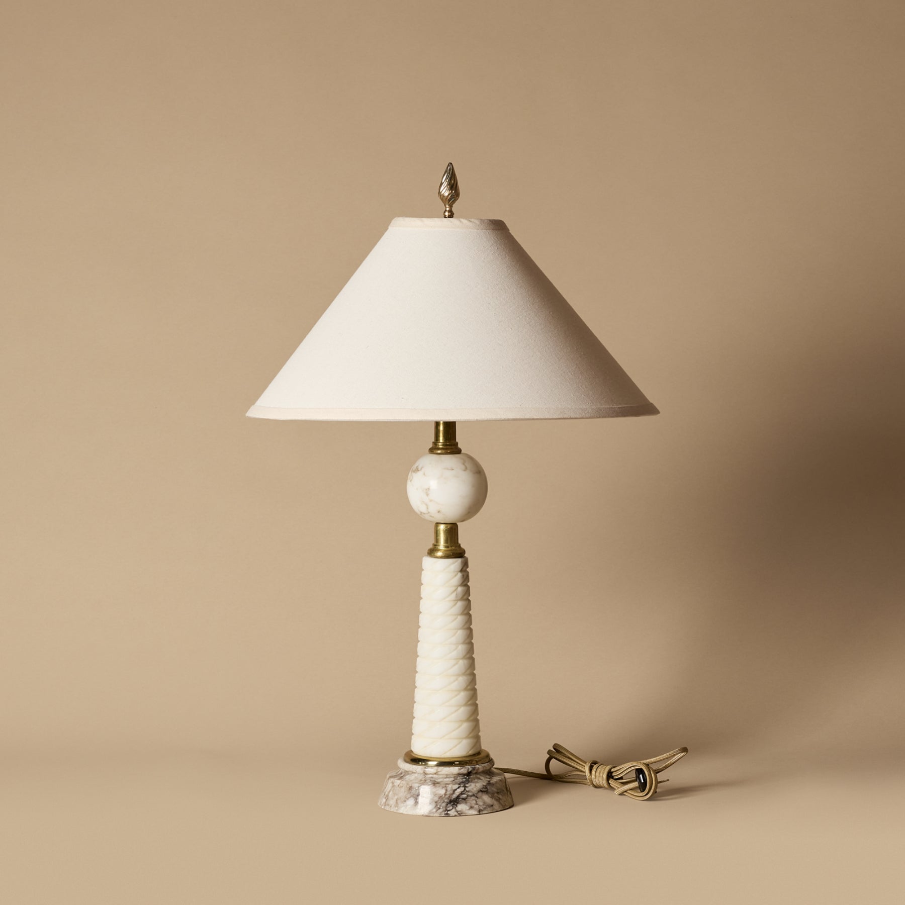 * Nécessite une ampoule plus petite que la norme. Les éléments en laiton ont une belle patine vieillie. Une marque foncée et une éraflure sont présentes sur la section en laiton au-dessus de la base. La base en marbre présente quelques taches blanches et de légères rayures éparses.