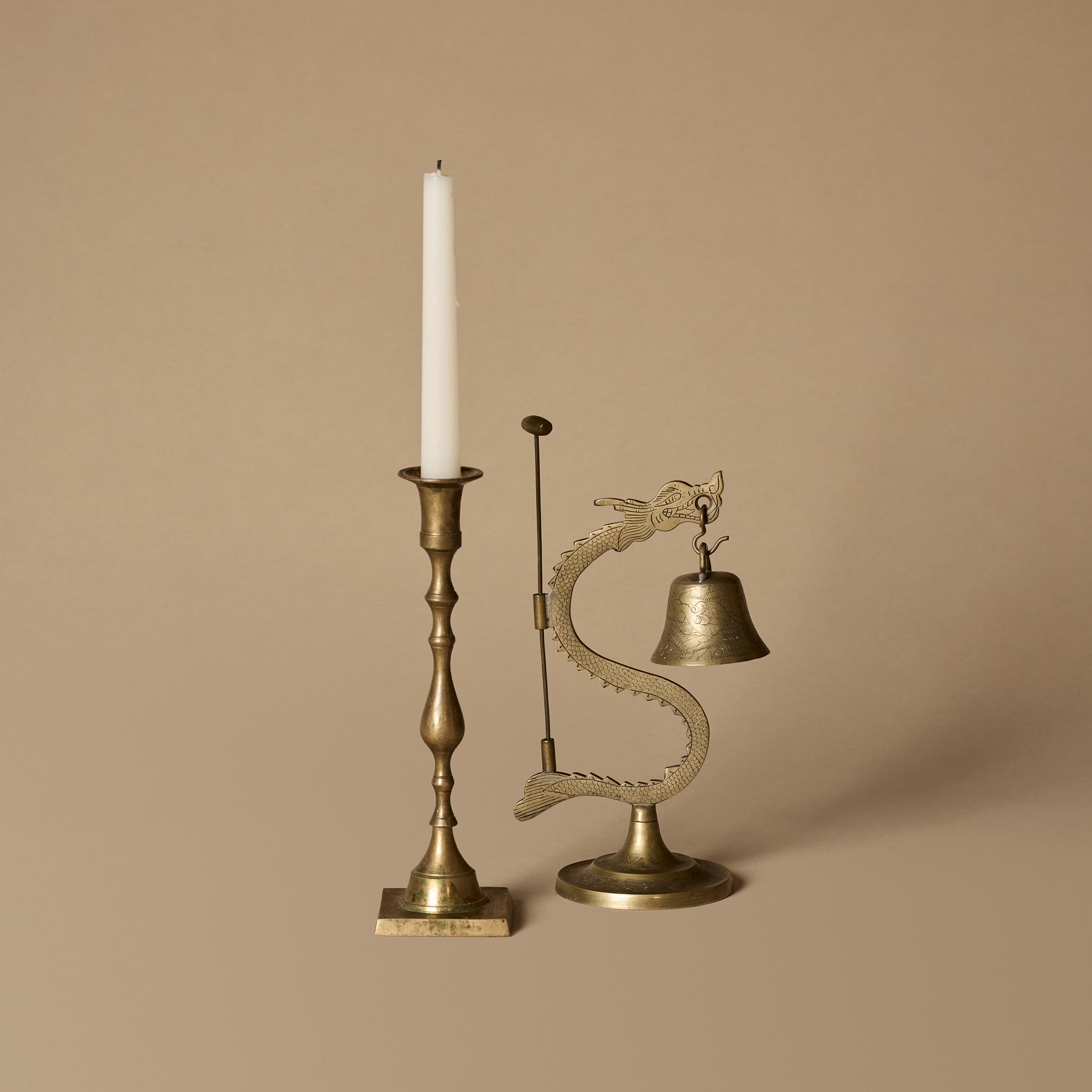 Duo de bougeoir et cloche dragon en laiton ancien