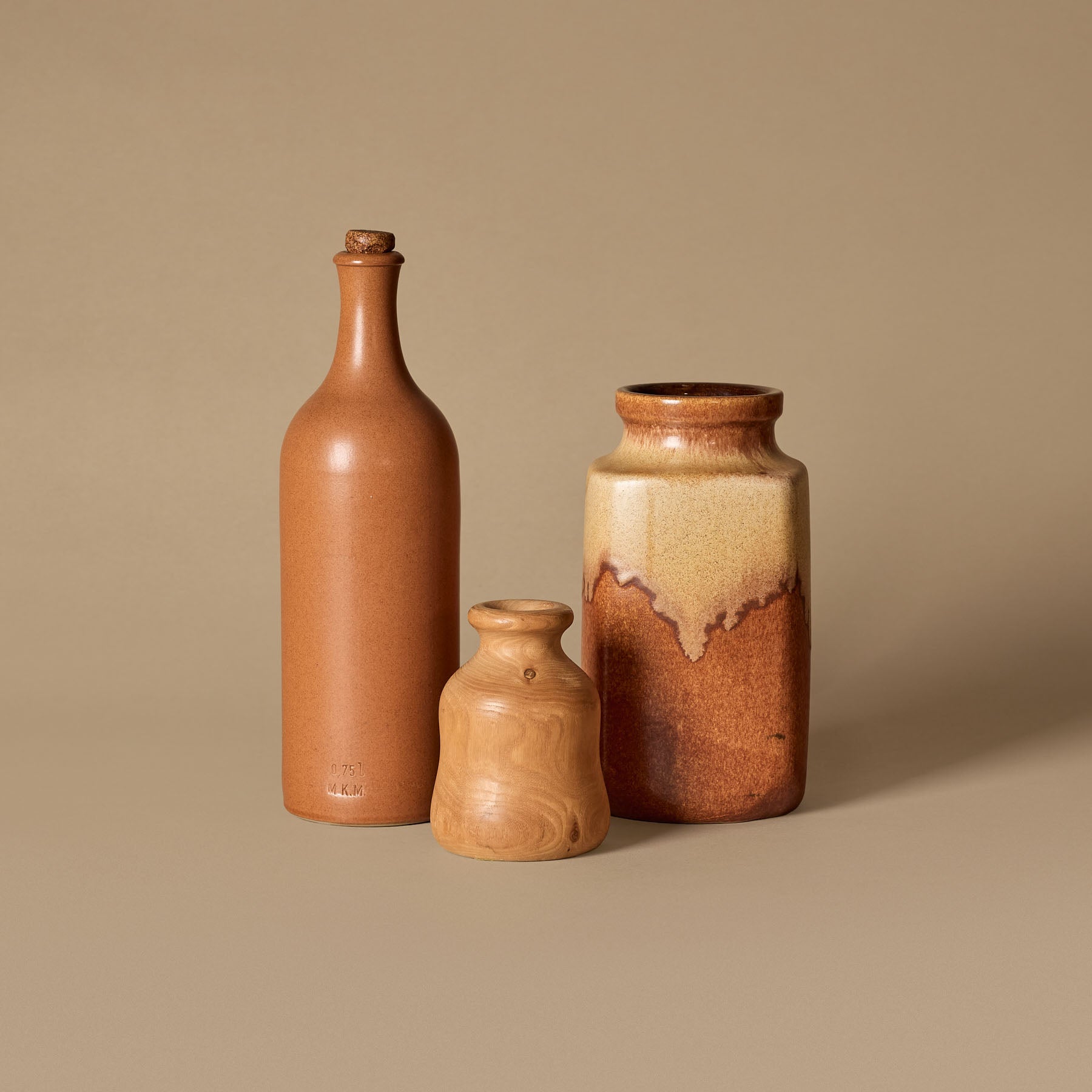 * Toutes les pièces présentent une légère usure due à l'âge. Le vase en bois porte l'inscription "Poulin" gravée en dessous. La bouteille en grès conserve son bouchon de liège, est marquée "MKM 0.75 L" sur le côté et présente de légères éraflures. Le vase carré est marqué "W. Germany 216-20" en dessous.