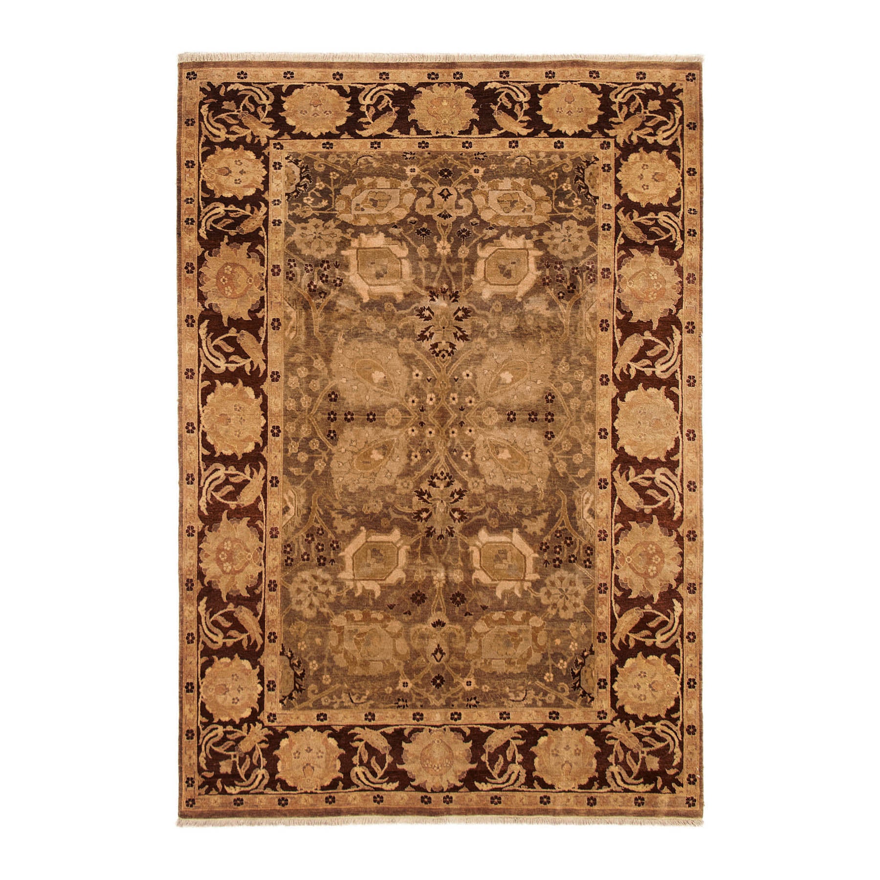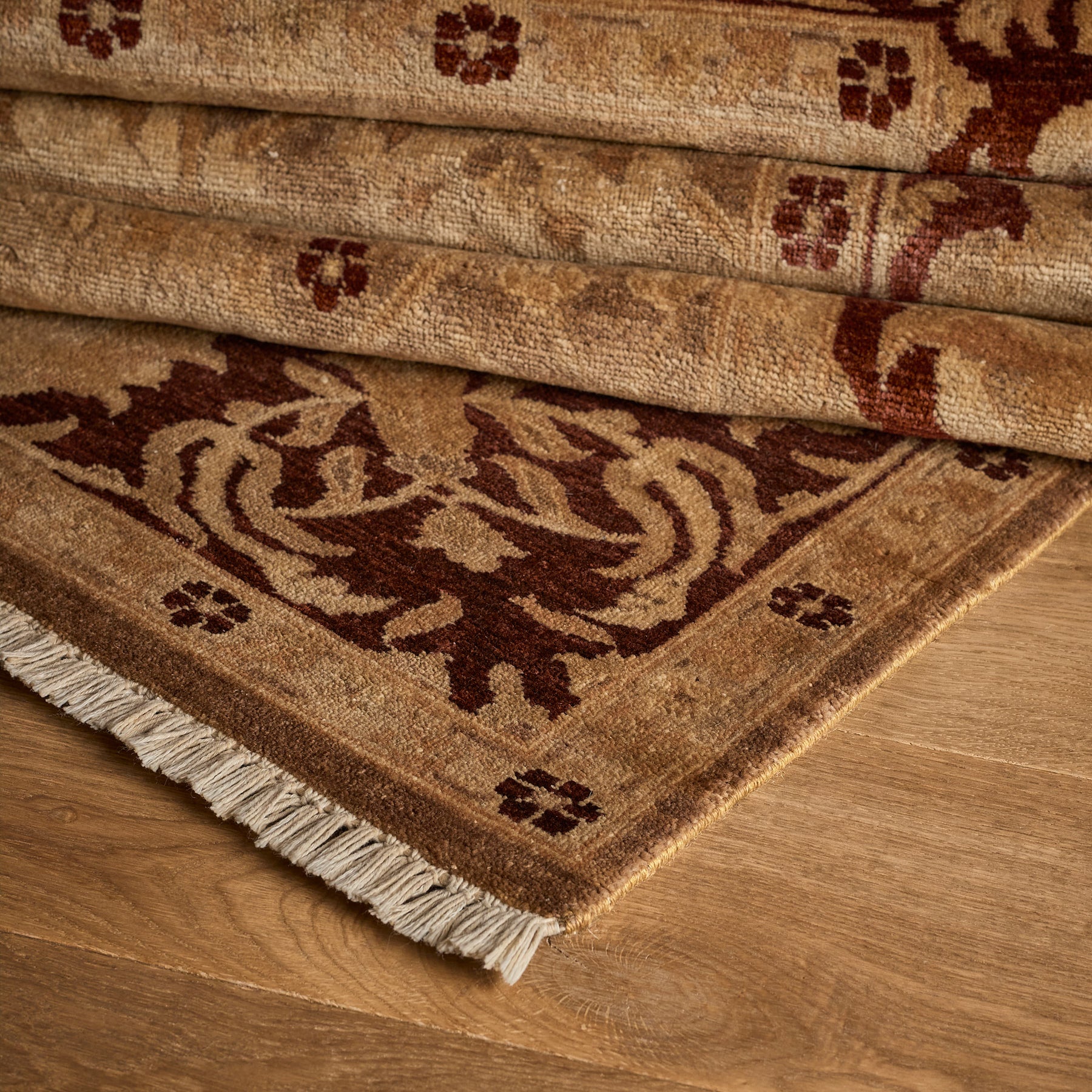 The Evee Rug is a luxurious one-of-a-kind rug constructed from 100% Wool and a cotton foundation. Beautifully hand-knotted and made by local artisans, this rug with beige, tan, brown, dark red, grey and khaki accents will bring warmth and refinement to any space.
