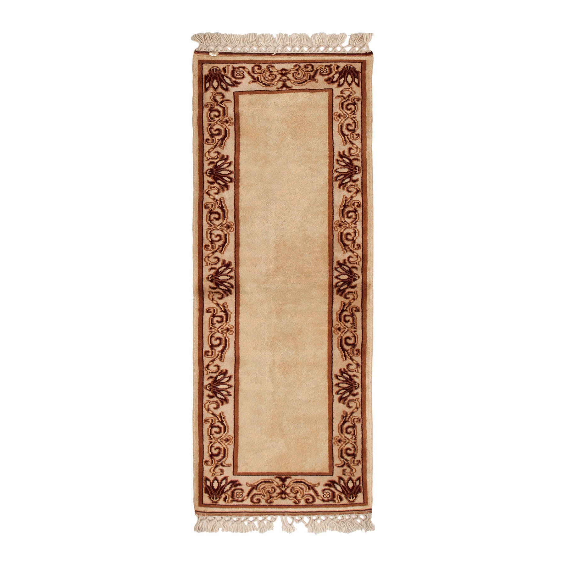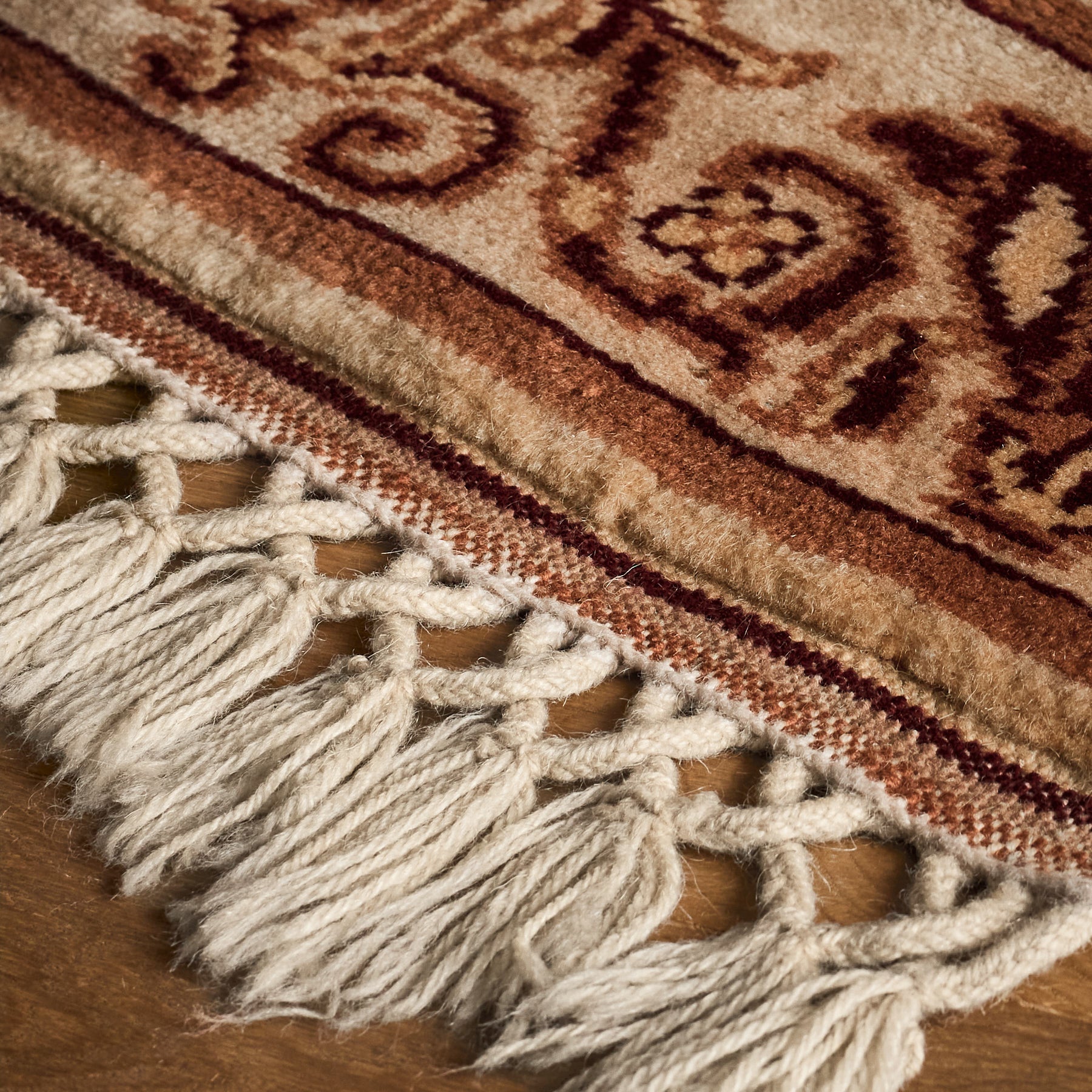 The Indira Rug is a luxurious one-of-a-kind rug constructed from 100% Wool and a cotton foundation. Beautifully hand-knotted and made by local artisans, this rug with beige, brown and dark red accents will bring warmth and refinement to any space.