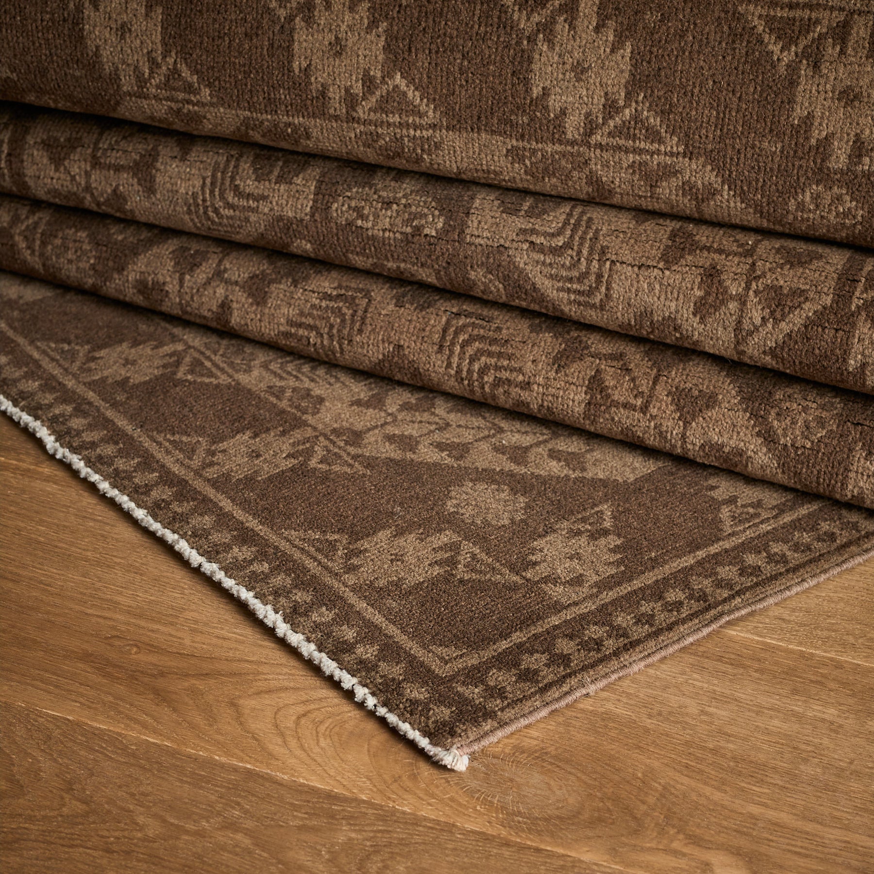 The Jarreth Rug is a luxurious one-of-a-kind rug constructed from 100% wool and a cotton foundation. Beautifully hand-knotted and made by local artisans, this rug with brown accents will bring warmth and refinement to any space.