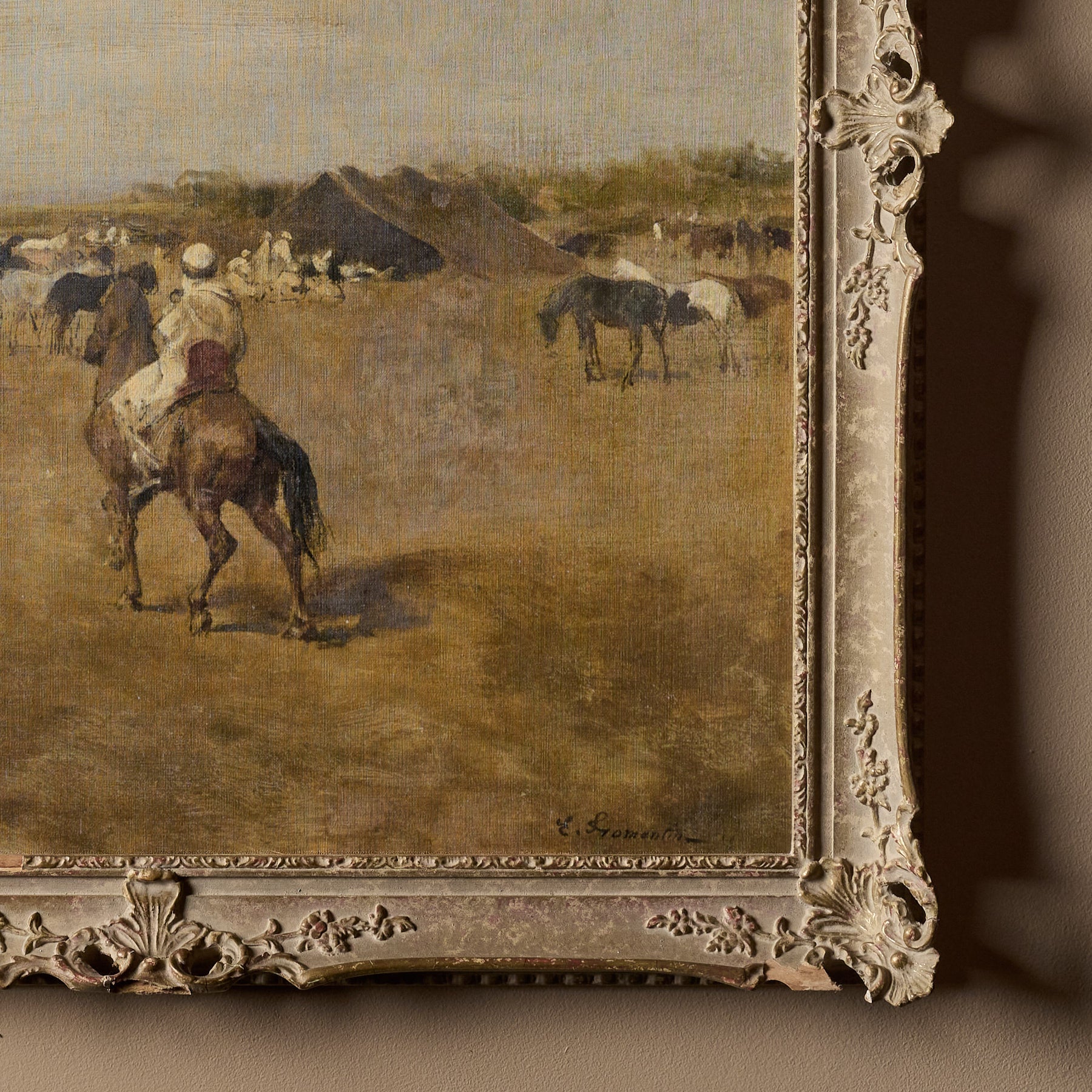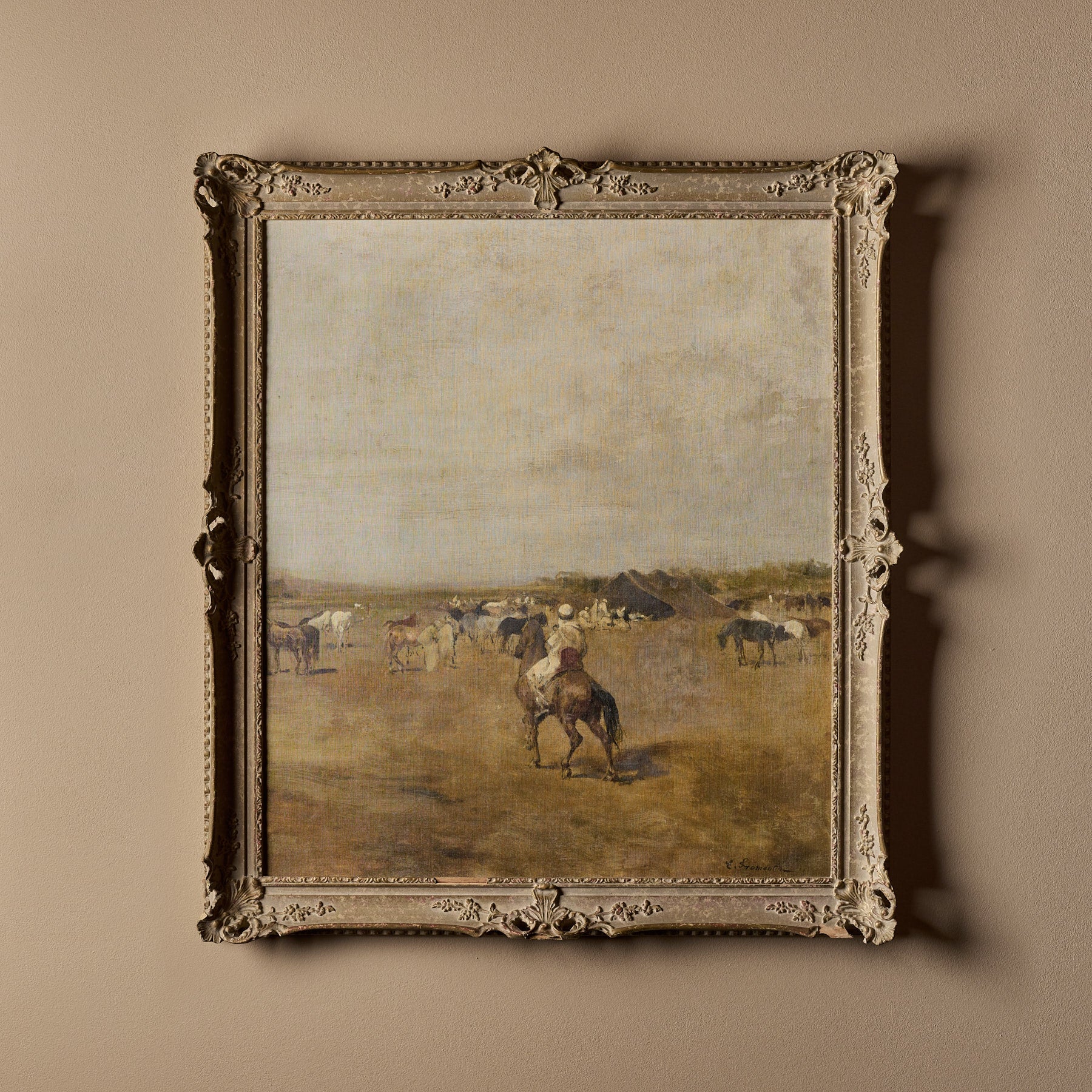 The frames themselves are 100% vintage. However, the canvas inside features a new print. We carefully curate artworks from various artists and pair them with vintage frames to create a unique and beautiful piece of art. Each composition is handmade.